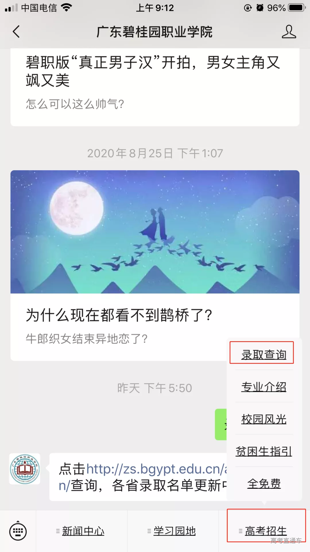 大家可以点击招生就业网http://zs.bgypt.edu.cn/action/或者在“广东碧桂园职业学院招就处”微信公众号点击“相关链接-录取查询”,也可以在学院官方公众号点击高考招生菜单查询录取结果,数据不断更新中。
