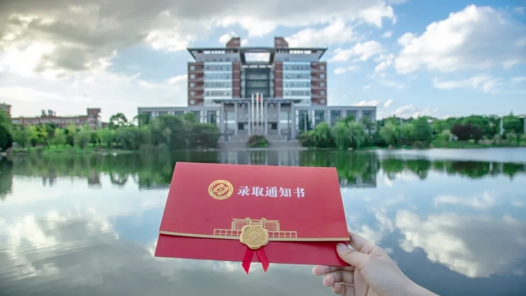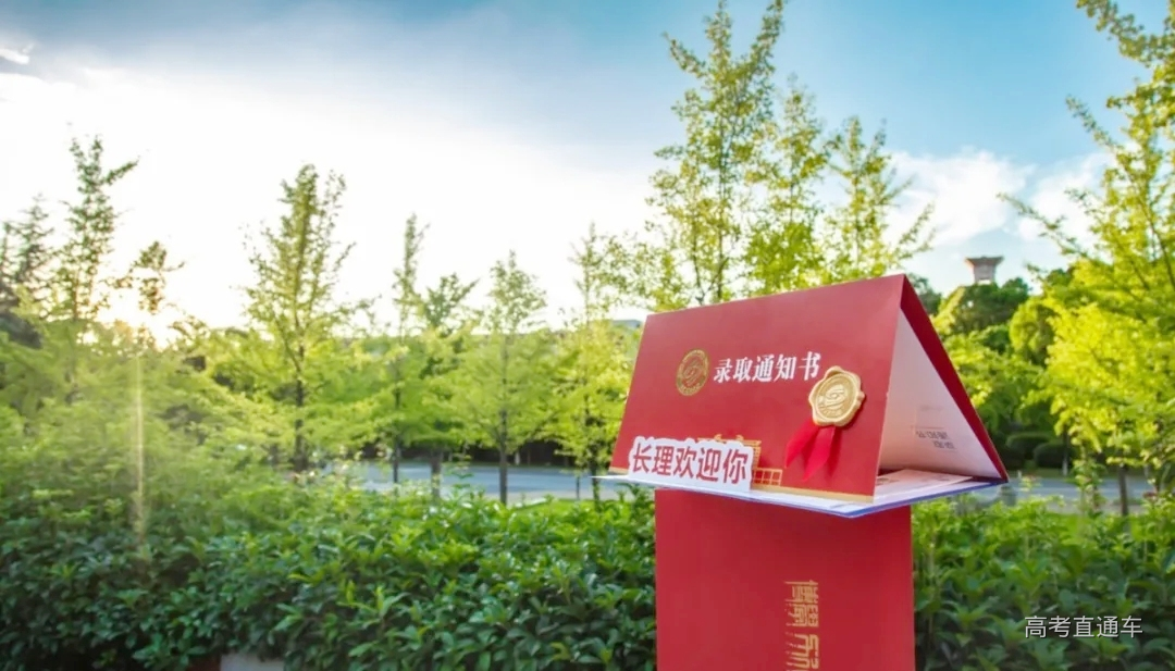 录取通知书以红色为主调,封面镶嵌烫金版校徽,底纹印刻学校图书馆,内页竖立“长理欢迎你”。