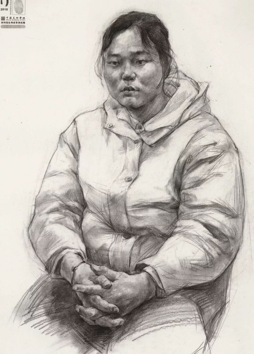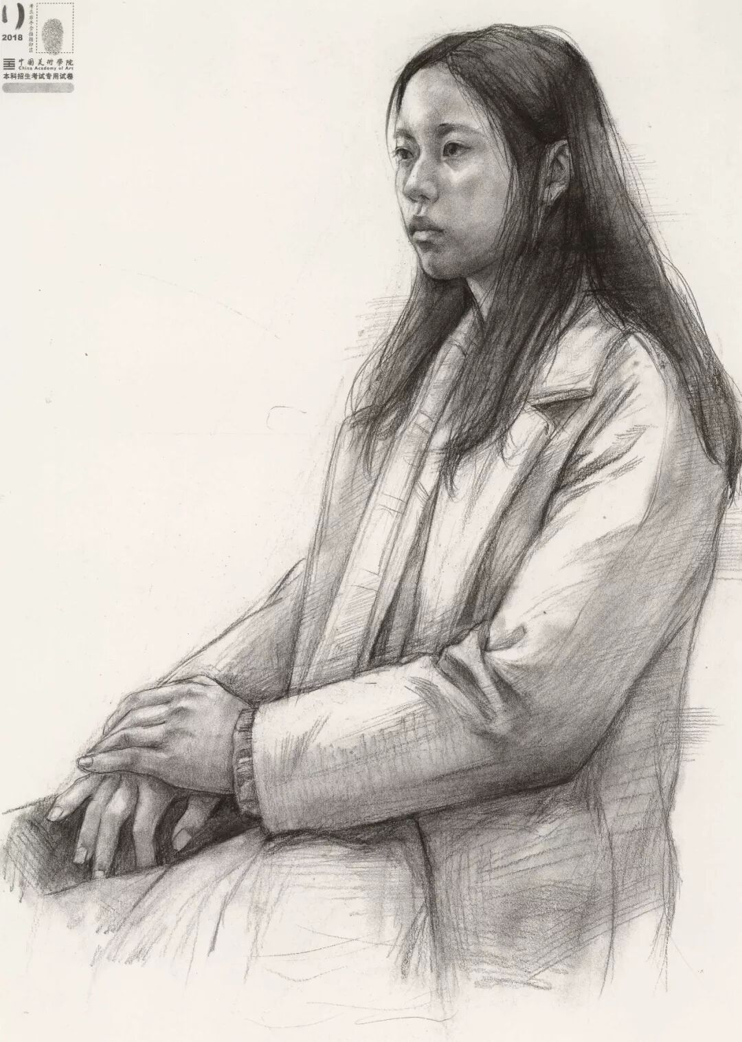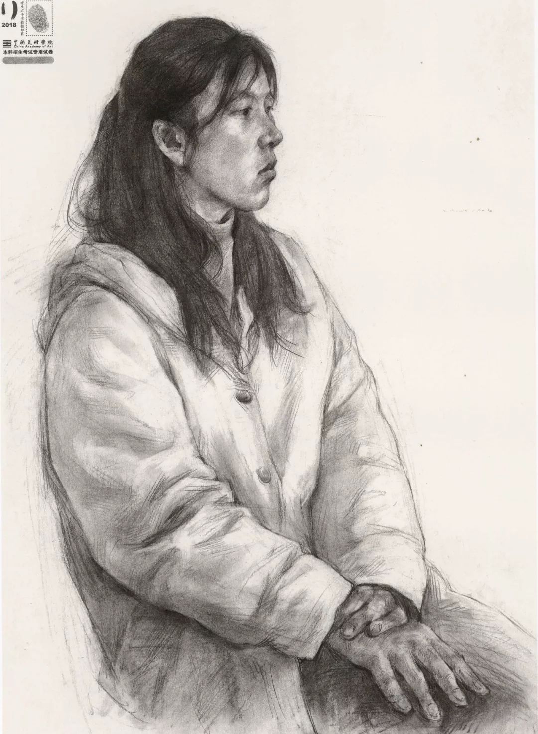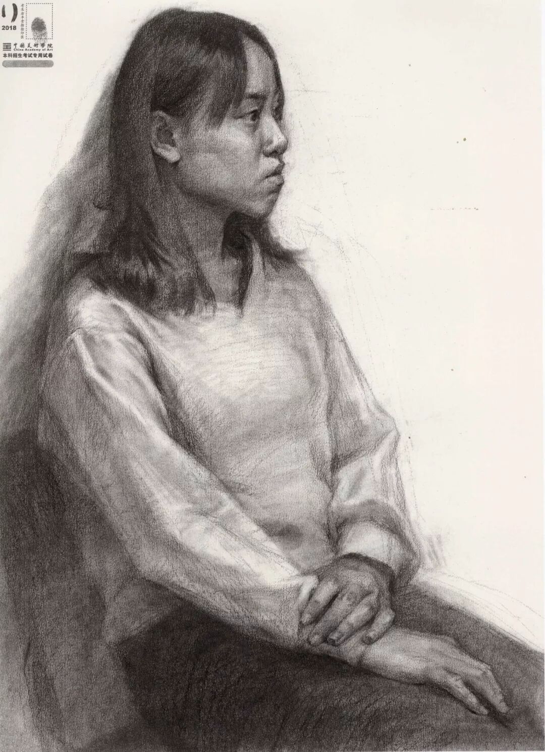 素描考题:半身像写生,30 岁左右女性,双手手心朝上,右手放在腿上,左手放在右手上
