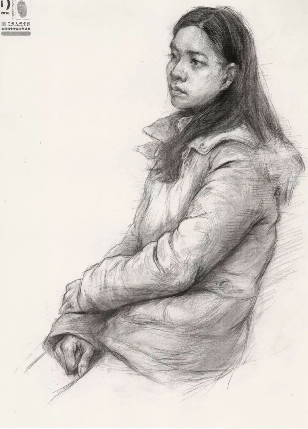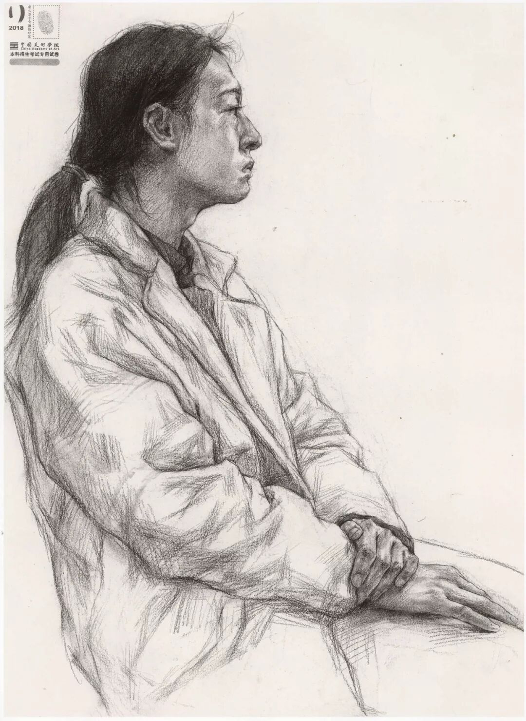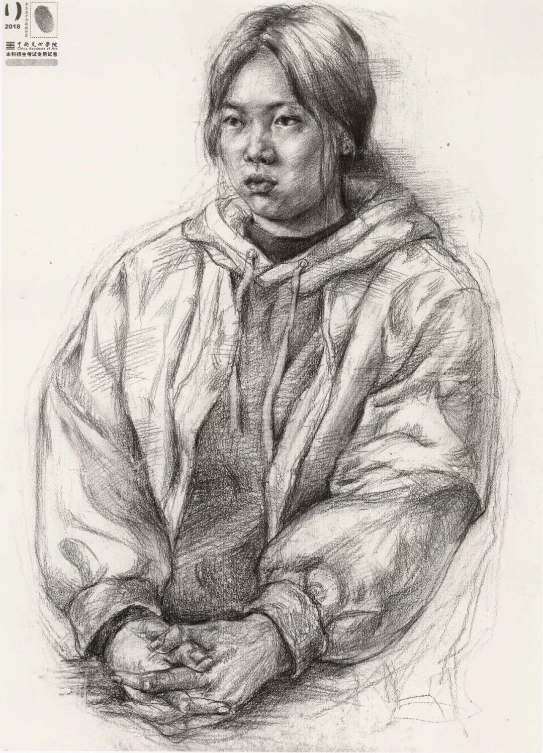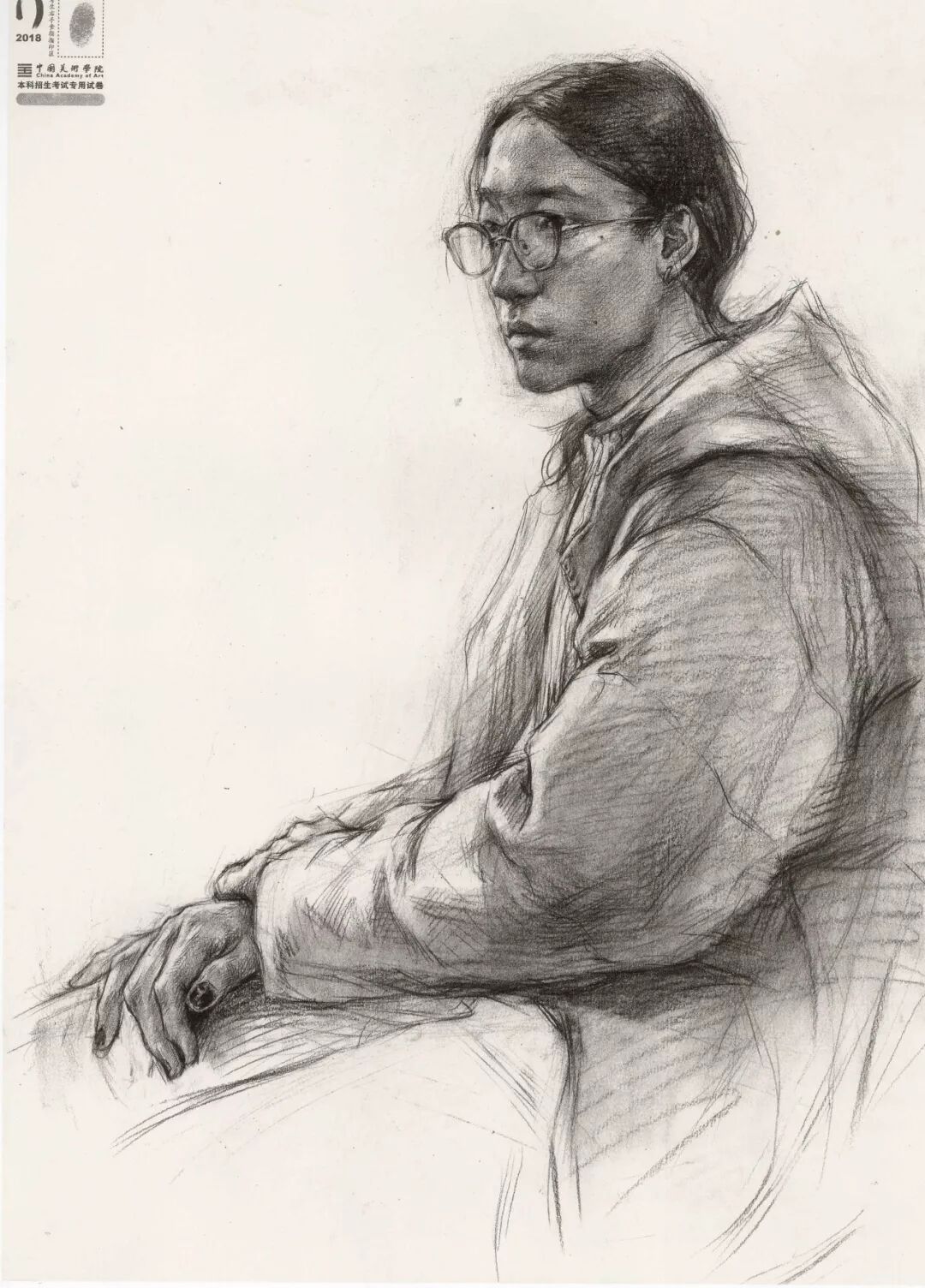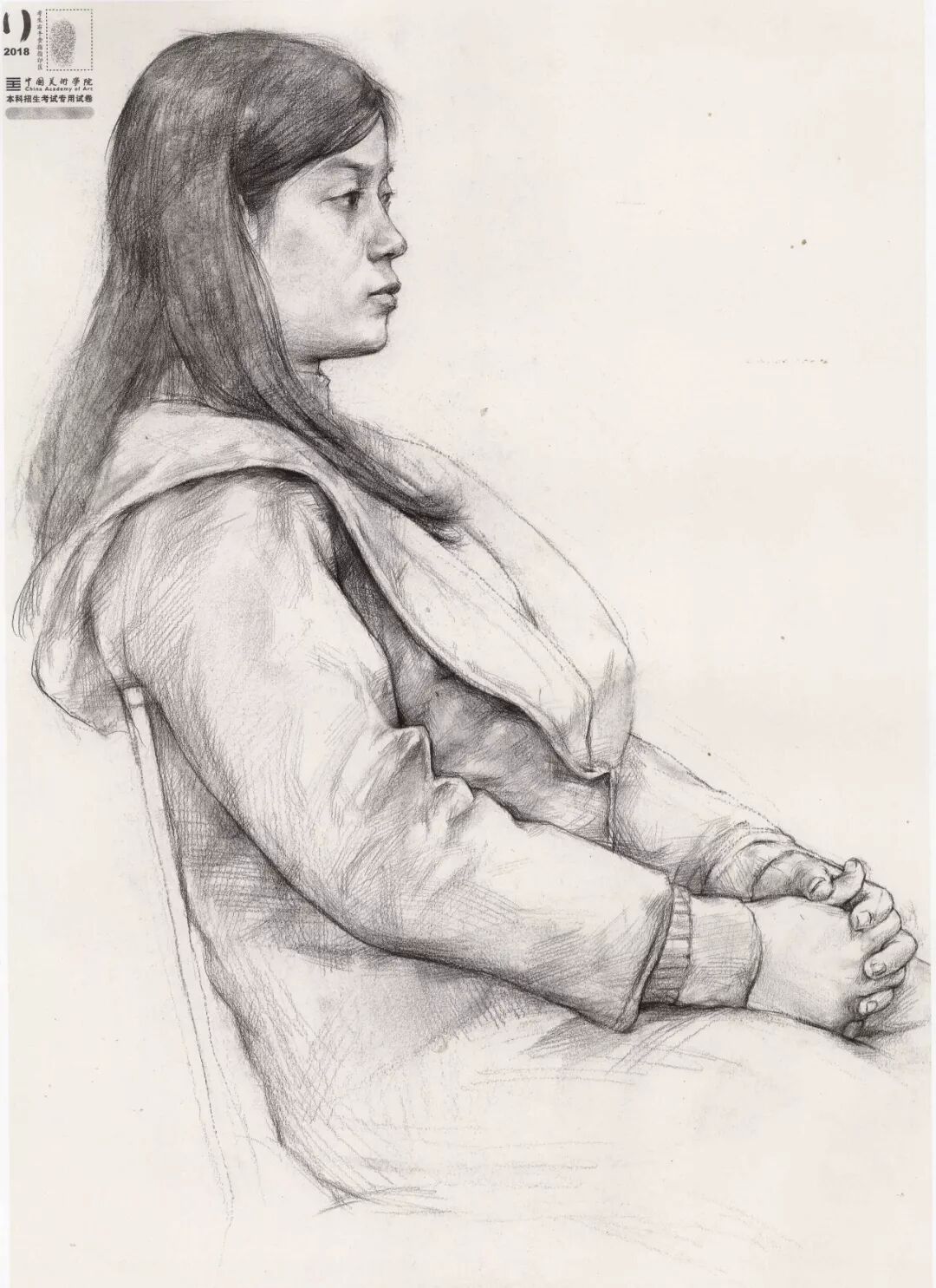 素描考题:半身像写生,30 岁左右女性,双手手心朝上,右手放在腿上,左手放在右手上