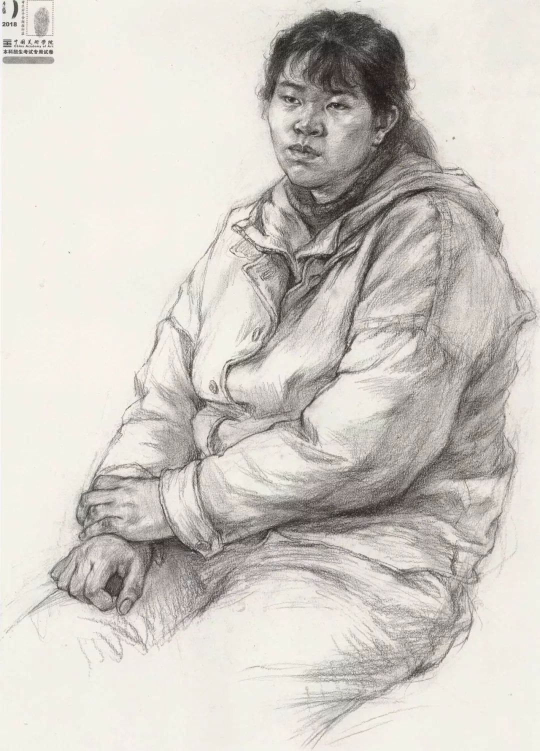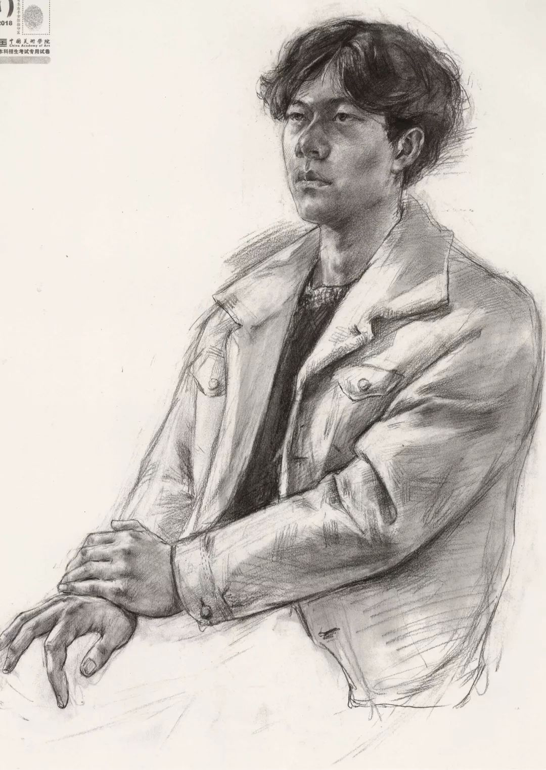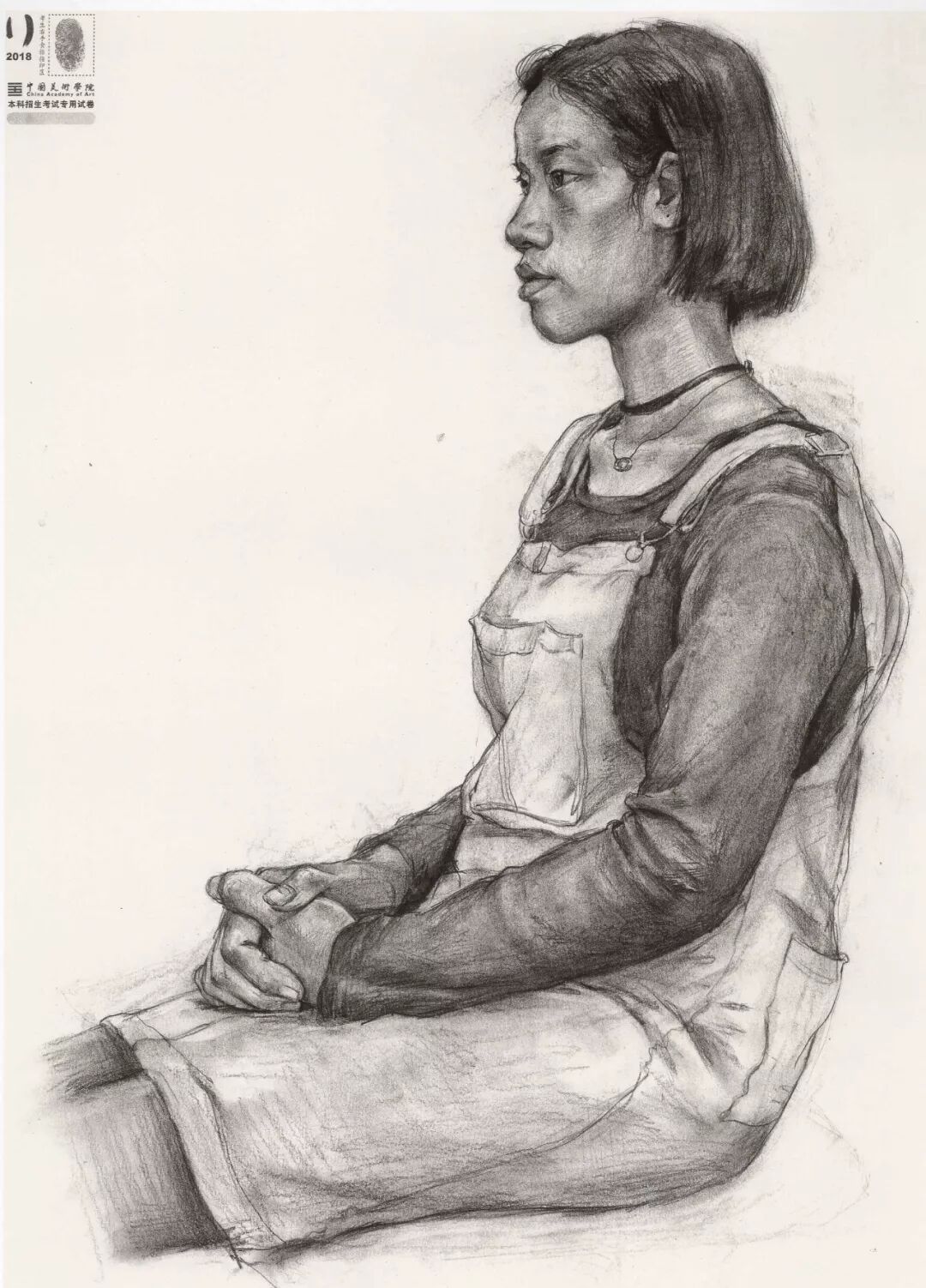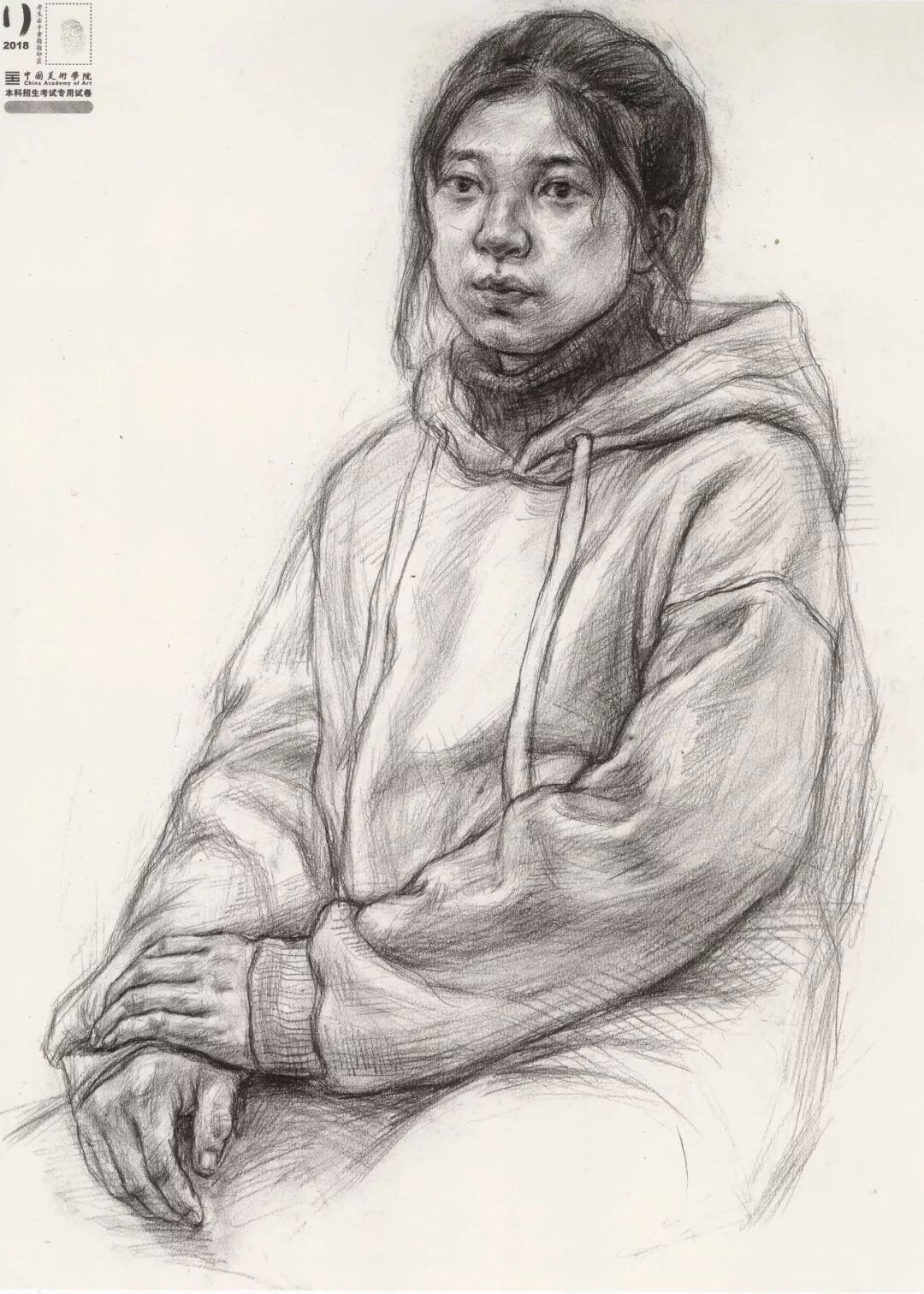 素描考题:半身像写生,30 岁左右女性,双手手心朝上,右手放在腿上,左手放在右手上