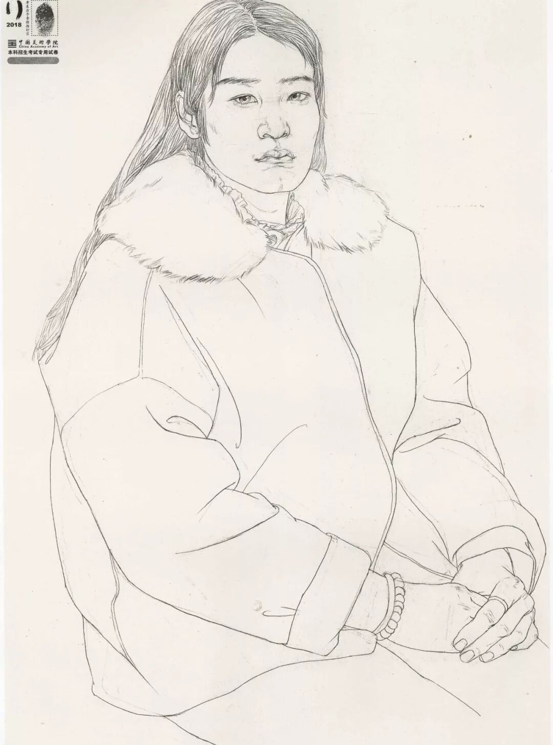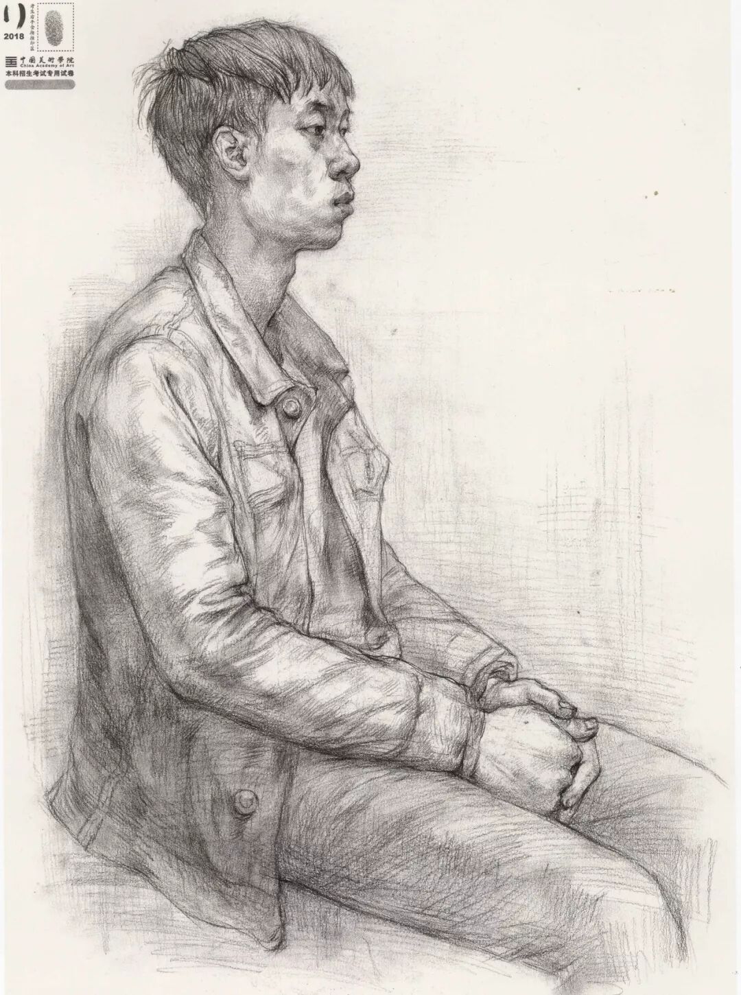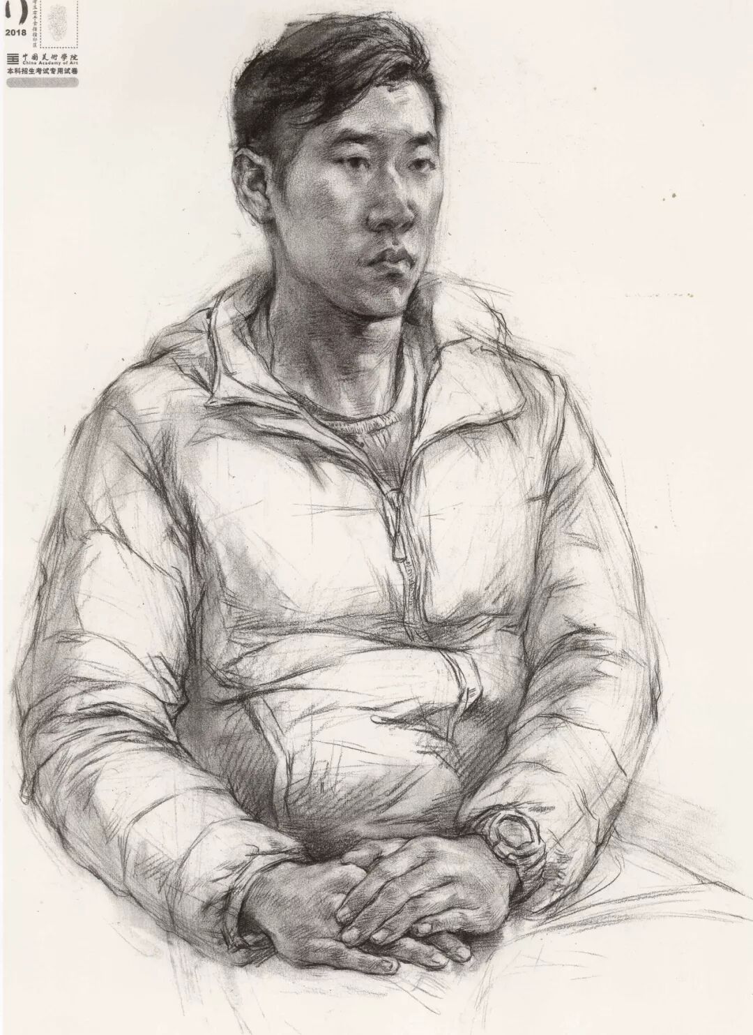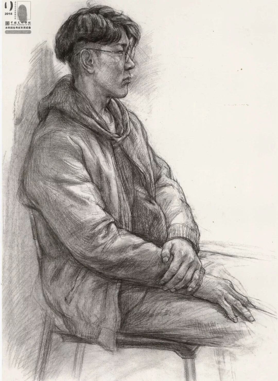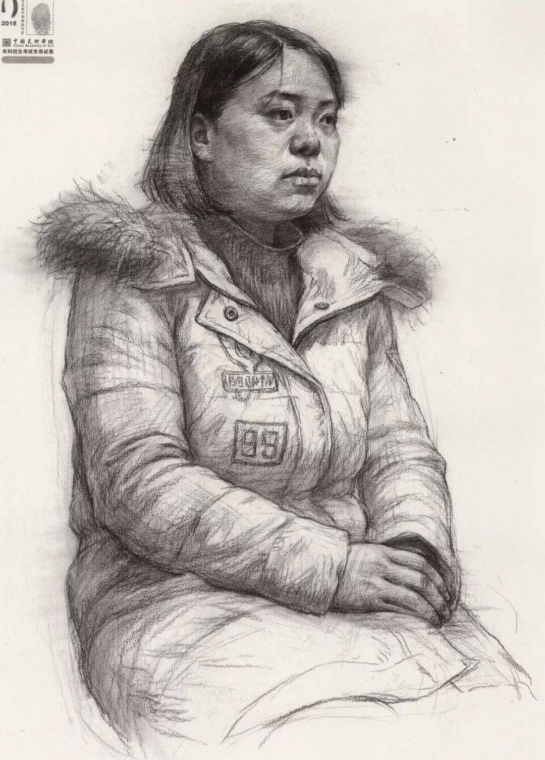 素描考题:半身像写生,30 岁左右女性,双手手心朝上,右手放在腿上,左手放在右手上