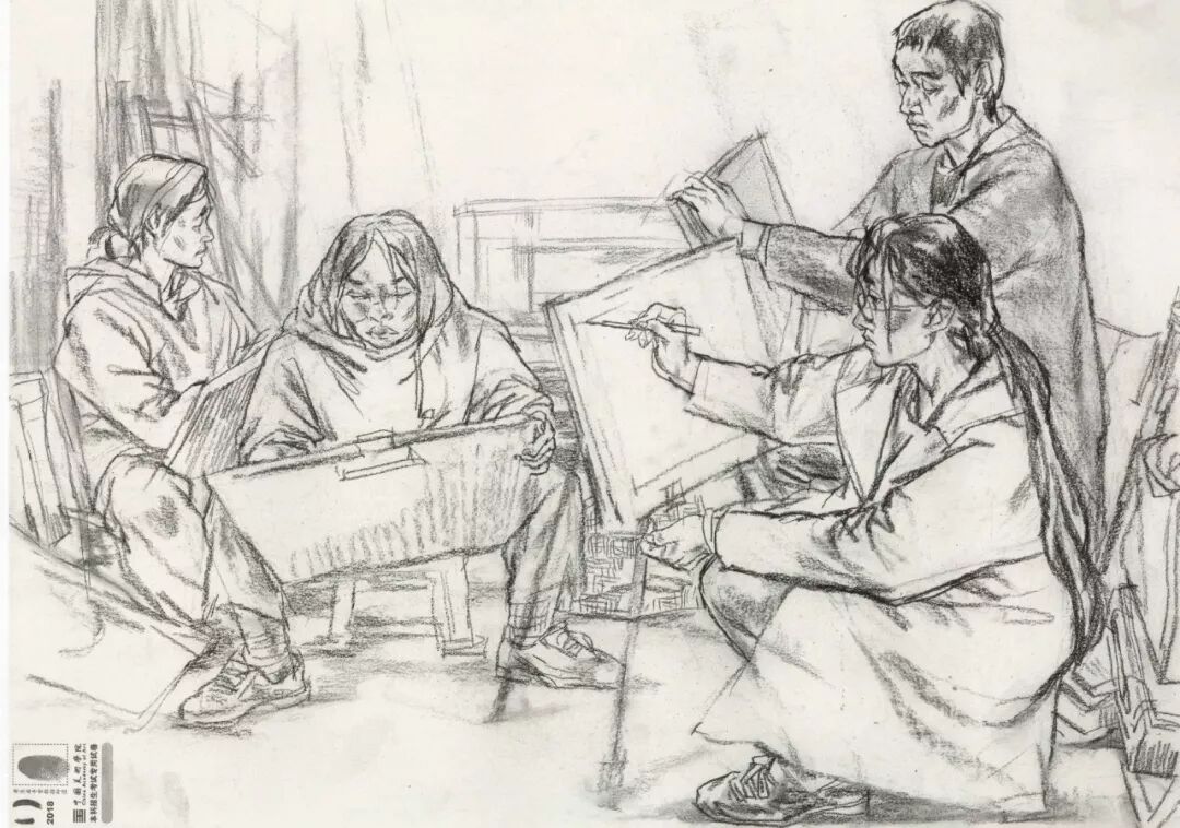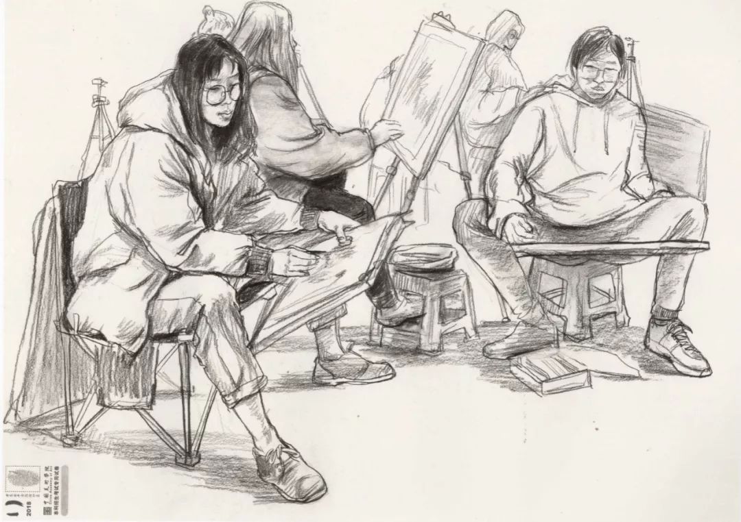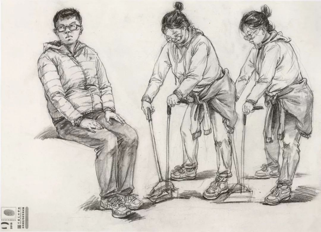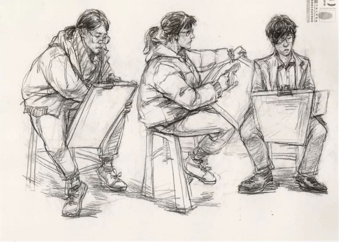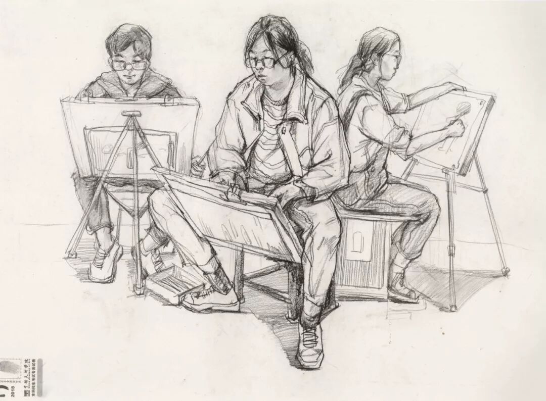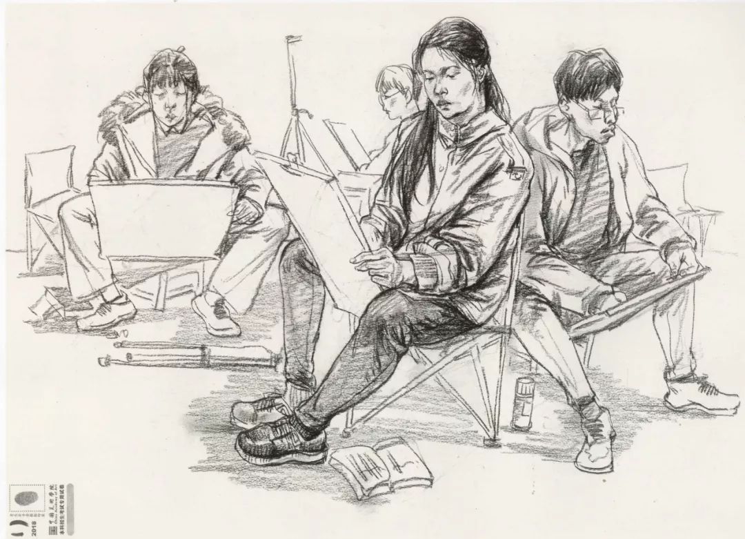 速写考题:考生互画三人场景,由三个人物组成,一个造型完整,另外两个自行安排