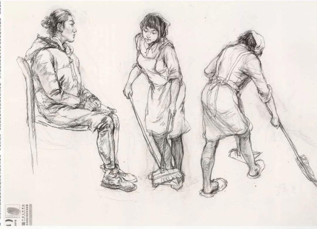 速写考题:四种人物动态默写,完成四个规定动作的默写:1、坐姿读书人物,2、站姿写生人物,3、拖地动态人物,4、蹲姿休息人物