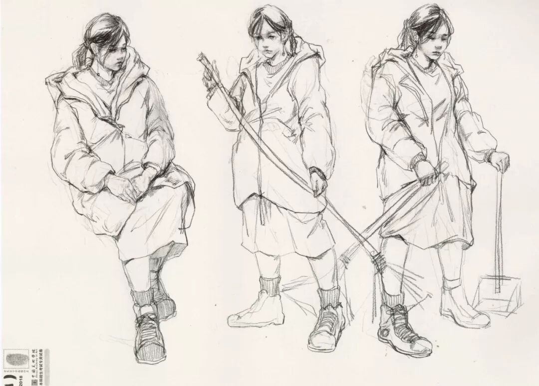默写:1、坐姿读书人物,2、站姿写生人物,3、拖地动态人物,4、蹲姿休息人物