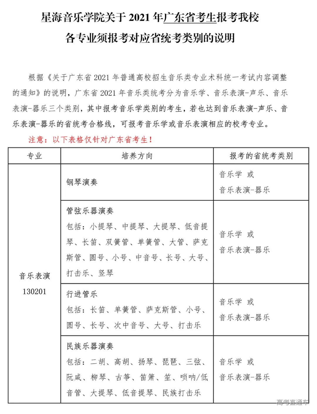 星海音乐学院关于2021年广东省考生报考我校各专业须报考对应省统考类别的说明