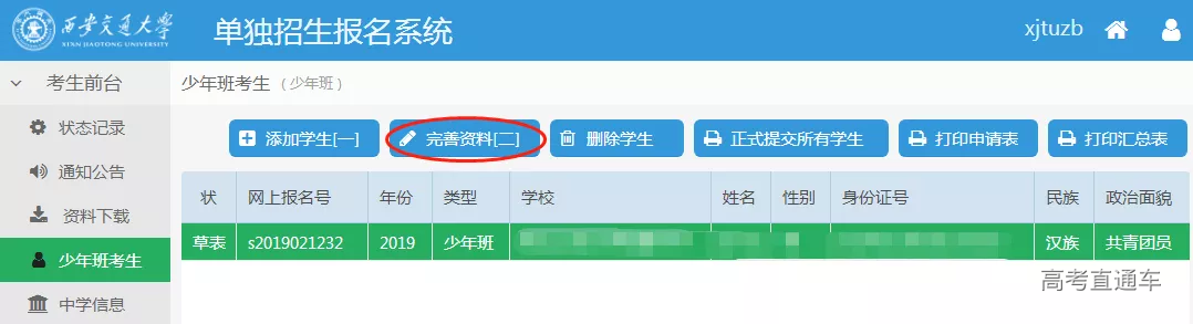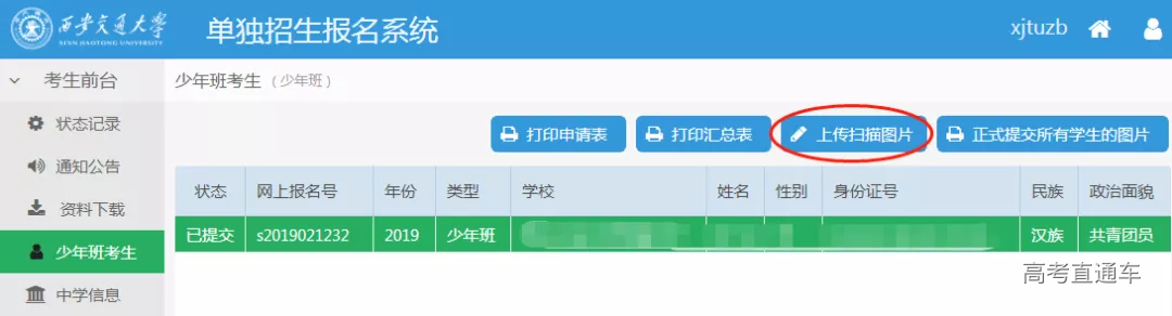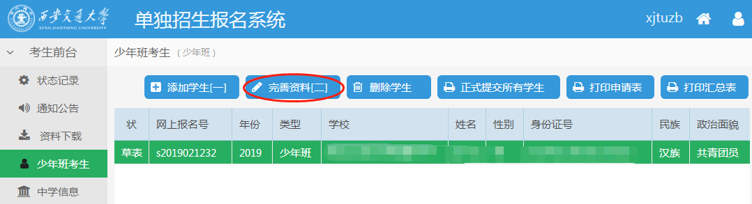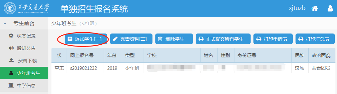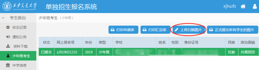 西安交通大学少年班报名流程 西安交通大学少年班今年招生报名工作已经开始,请有意向报考的初中应届毕业生与所在中学联系报名。(注意:西少班只接受中学或已委托的地市招办为单位进行报名) 请报名单位登陆招办主页(zs.xjtu.edu.cn),点击页面中间的“网上报名”开始报名,或者直接打开报名网站 http://zzzs.xjtu.edu.cn/ZZZS/login.do 首次参加少年班的中学请先注册账号,登陆后在“资料下载”页面下载《少年班中学推荐资格申请表》并传真至我办(029-82668322)或发送邮件到xjtuzs@xjtu.edu.cn,收到申请后第二个工作日即可开始报名。 已有账号的中学老师可以使用往年的用户名、密码登陆,如学校信息有变请更新,然后完成报名。 报名过程中有任何问题请拨打咨询电话029-82668320。 报名流程: 1、报名系统首页 2、注册 3、注册完成后登陆,新学校请在“资料下载”页面下载《少年班中学推荐资格申请表》并发送至我办,收到申请后第二个工作日即可开始报名。 4、在“资料下载”页面下载《少年班报名申请表(样表)》,并发给报名学生填写。 5、选择并完善中学信息(老用户如果需要修改联系人、联系电话请从此开始)。 6、收集完学生填报的样表,点击左侧菜单栏的“少年班考生”,开始网上填报。 7、点击页面上方的“添加学生[一]”,填写学生基本信息并保存。 8、选中一个学生,并点击页面上方的“完善资料[二]”,依次上传学生照片,填写学习经历、家庭成员、学习成绩、获得奖励和个人自述等信息。 9、上传照片时按照下图所示的步骤进行(需要浏览器支持最新的flash插件)。 选择本地照片(白底证件照) 鼠标放在照片上,拖动裁切框,使得头像处于框中央,四周不留空白 点击“裁切”按钮,可在右侧看到预览图,如预览效果不佳请重复上一步操作 照片裁切好后点击“裁切好了,开始上传” 10、完整填写学生的每部分信息并保存。 11、填写完学生所有信息后点击页面上方“打印申请表”,可打印报名草表,并分发给学生核对。 12、如果打印时出现如下提示,请先下载安装打印插件(也可在资料下载页面下载)。 13、所有学生核对无误后,点击页面上方“正式提交所有学生”。正式提交后所有信息不可修改,请确保信息正确后再提交。 14、再次点击页面上方“打印申请表”,打印正式报名表(页面右上方有条形码)。 15、点击页面上方“打印汇总表”,打印报名学生汇总名单。汇总表打印出来后需要手工填写班级、年级、综合排名等信息。 16、正式申请表和汇总表经中学签字盖章后扫描(或拍照,所有图片保证文字清晰)成JPG格式图片,与学生户口本图片(首页及本人页)、学籍信息表首页图片、身份证图片(没有可不传)一同上传。每位学生的图片上传到本人名下,汇总表扫描件可与任意一位学生图片一起上传。 17、选择文件时,文件类型选“所有文件”,可一次上传一个学生的多张图片。 18、依次上传完所有学生图片后点击页面上方“正式提交所有学生的图片”,报名结束。 19、报名结束后请随时登陆报名网站或招办主页查看审核结果、网上缴费、打印准考证等后续通知安排。 注:本文为去年的报名操作流程,仅供参考,如有出入,请以报名网站操作指示为准。
