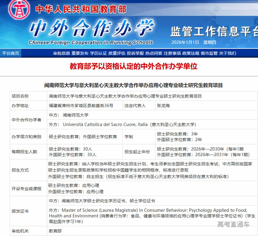 近日,教育部正式审批通过我校与意大利圣心大学合作举办应用心理专业硕士研究生教育项目。该项目是我校首个中外合作办学项目,实现了我校国际化办学新突破,同时也填补了福建省心理学学科领域与世界高水平大学开展中外合作办学的空白。