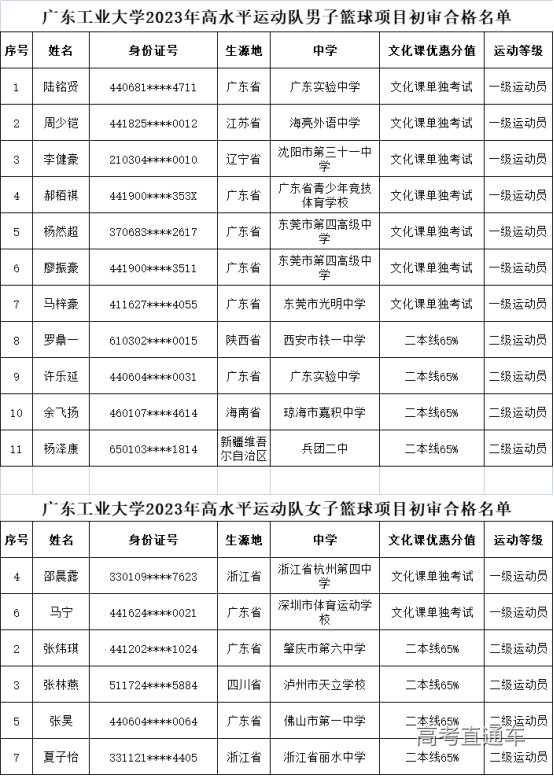 根据《教育部办公厅 关于做好2023年普通高校部分特殊类型招生工作的通知》(教学厅〔2022〕8号)精神和《广东工业大学2023年高水平运动队招生简章》有关规定,经考生自主报名和我校高水平运动队报名资格审核工作小组审核,拟确定我校2023年高水平运动队招生(篮球项目)体育专业测试报名资格初审合格名单(具体名单见附件1),现予以公示,公示期内如有任何异议,请以电话或电子邮件方式向我办反映。反映时须提供真实姓名,须有具体事实。匿名举报或不能提供事实材料,一律不予受理。