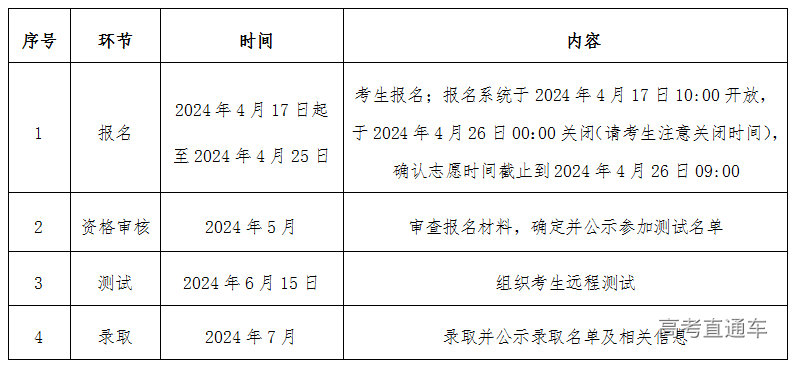 报名时间为2024年4月17日 - 2024年4月25日。报名系统于2024年4月17日10:00开放,于2024年4月26日00:00关闭(请考生注意关闭时间),确认志愿时间截止到2024年4月26日09:00,未确认志愿的考生报名无效。