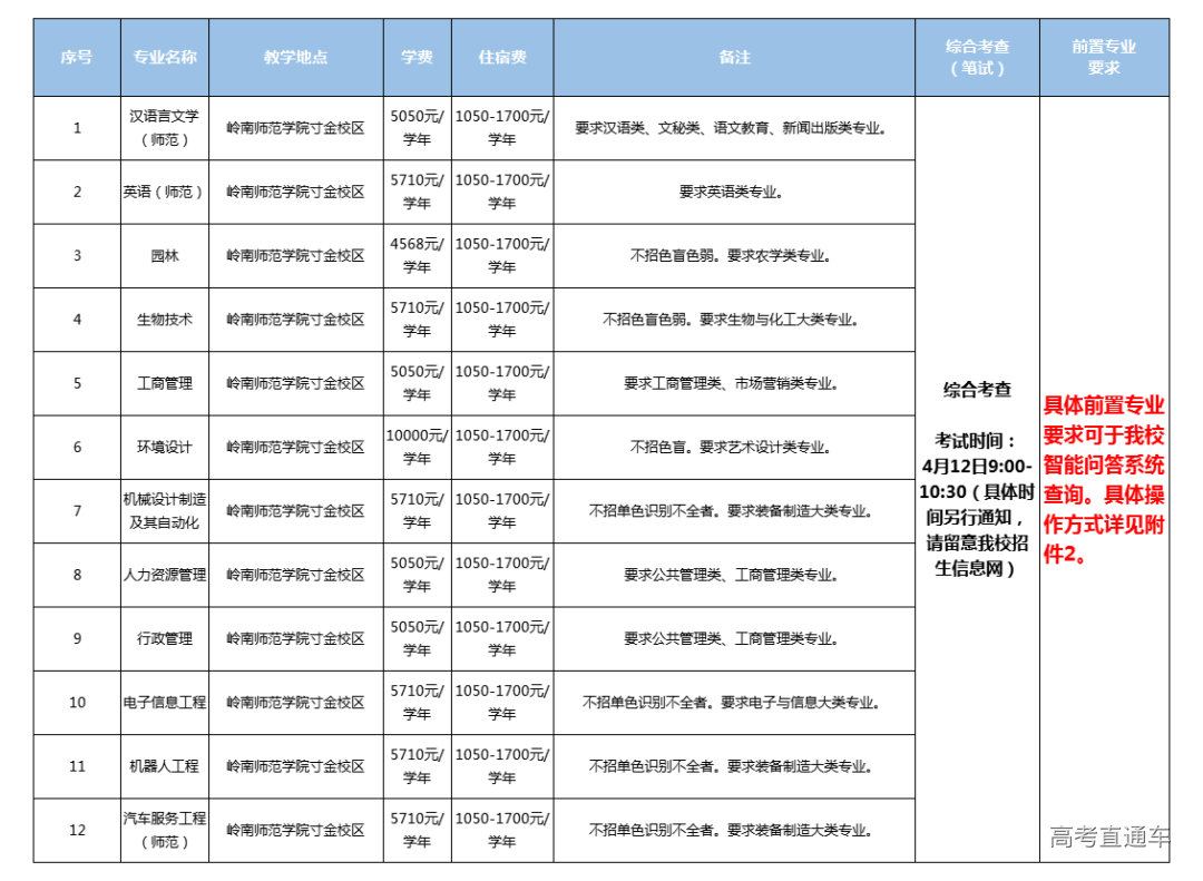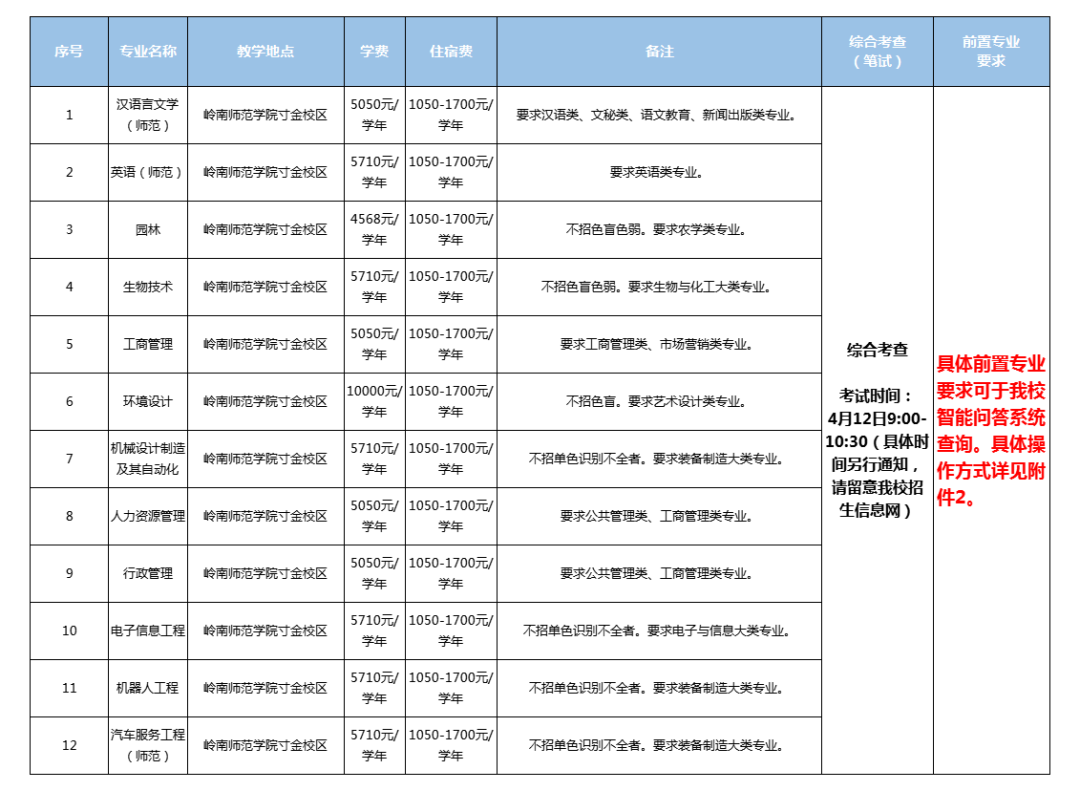 (一)报名办法 具体报名办法详见《关于做好广东省2025年普通高等学校专升本免文化课考试招收退役大学生士兵工作的通知》(粤招办普〔2024〕51号)。 (二)填报拟参加综合考查的院校专业组 获得退役大学生士兵资格的考生须在3月20日—3月22日期间登录“广东省2025年普通高校专升本报名系统”(下称系统)(http://www.eeagd.edu.cn/ptzsbks)选择填报拟参加综合考查的院校专业组。 考生填报拟参加的综合考查以院校专业组为单位,每位考生最多可填报5个拟参加综合考查的院校专业组,不需填报具体专业。我校招生专业组均有前置专业要求和身体条件要求,考生填报前,务必要仔细查阅我校各招生专业组的各项要求。如因不符合我校专业组前置专业或身体条件要求而导致后续的填报志愿无效或投档后无法录取,责任由考生自负。 报名系统会动态更新各院校专业组报考人数,考生在截止时间前可不限次数调整院校专业组,调整截止时间与填报截止时间一致,考生最终填报的院校专业组以填报截止前最后一次提交的为准。填报截止后,省招生办不再接受调整院校专业组申请。 填报拟参加综合考查的院校专业组截止后,省招生办将各院校专业组报考名单发各招生院校。考生可通过报名系统自行查看各院校专业组最终报考人数 (三)缴费 报名考生需交报考费40元/科。交费成功的考生才能参加编排考场座位、打印准考证;否则视为放弃报名资格。交费后自动放弃考试资格的,不予退回报考费。 (1)缴费时间:2025年3月27日—31日17:30。 (2)缴费方式:报名成功的考生可通过扫描微信二维码,按步骤完成缴费(缴费流程及事项详见附件1) 三、 招生专业及要求 我校2025年退役大学生免文化课考试普通专升本共12个拟招生专业。根据教育部文件要求,退役大学生士兵报考的本科专业应与就读的高职(专科)专业大体对应。 具体拟招生专业目录和要求如下: 四、 综合考查方式 符合退役大学生士兵报名资格的考生免文化课考试。但需参加我校自行组织的综合考查笔试考试,考试时间为4月12日9:00-10:30,考试地点为岭南师范学院(地址:广东省湛江市赤坎区寸金路29号)。《综合考查》考试大纲详见附件3。 五、 打印准考证 考生可自行在岭南师范学院招生信息网(http://zsb.lingnan.edu.cn/)打印准考证,请考生于考试前留意我校官网通知。 六、 志愿填报 2025年退役大学生士兵普通专升本志愿填报方式按广东省教育考试院另文通知要求进行填报。 七、 录取 我校退役大学生士兵普通专升本招生按照省招生委员会办公室向社会公布的录取规则择优录取考生。 (一)省招办投档后,我校结合考生综合考查成绩、考生志愿、在校期间成绩及服役期间表现等情况,综合评价,按我校退役大学生士兵招生计划1:1择优录取。 (二)综合考查成绩相同的同时投档,结合综合评价择优录取。 (三)不录取综合考查成绩分数为零分、前置专业不符合要求或服役期间受到处分的考生。 (四)在退役大学生士兵录取阶段已被录取的考生,不再参加后续的普通专升本投档录取。 (五)经公示符合服兵役期间荣立三等功及以上奖励相关政策的高职(专科)退役士兵考生,如符合报考专业要求,可免试入读。 (六)退役大学生士兵只进行一次投档录取,原则上不进行征集志愿或调剂,考生须合理报考,避免滑档。 (七)从2022年起,对享受免文化课考试政策被录取后未报到、自行放弃入学资格的退役大学生士兵,不再享受免试普通专升本政策。 (八)对弄虚作假获得报名资格的,一经发现,取消报名资格;对违规录取及其他不符合录取资格的考生坚决取消录取资格或入学资格。 八、 收费标准 被录取新生收费标准按省物价局的规定执行。 九、 在校学习期间的管理 普通专升本学生为国家任务生,秋季入学,全日制脱产学习,由招生学校进行思想政治、专科学历、健康情况复查,经复查未通过的,取消其入学资格;复查合格并经注册后,即成为学校的正式学生,插入本科专业三年级学习,并按插入年级的管理办法进行管理,在校期间不可办理转专业。 十、 毕业与就业 普通专升本学生修完本科教学计划规定的课程,德、智、体考核合格,准予本科毕业,发给本科毕业证书。毕业证书上标注“在本校XX专业专科起点本科学习”。符合《中华人民共和国学位条例》规定者,授予相应的学士学位。普通专升本学生毕业后的就业办法,与普通高校本科毕业生相同。 十一、 咨询、监督与申诉 咨询电话:0759-3183211 咨询QQ:1927426150、2486457472 邮箱地址:Lszsb211@126.com 招生网址:http://zsb.lingnan.edu.cn 监督申诉电话:0759-3183189 寸金校区:广东省湛江市赤坎区寸金路29号 (邮编:524048) 湖光校区:广东省湛江市麻章区湛江教育基地教育城四路8号 (邮编:524088)