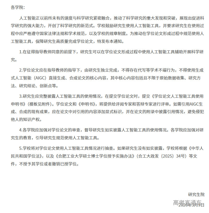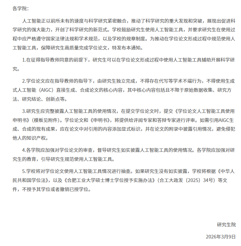 3月9日,合肥工业大学(以下简称“合工大”)发布通知,对研究生在学位论文中使用人工智能工具做出规范。