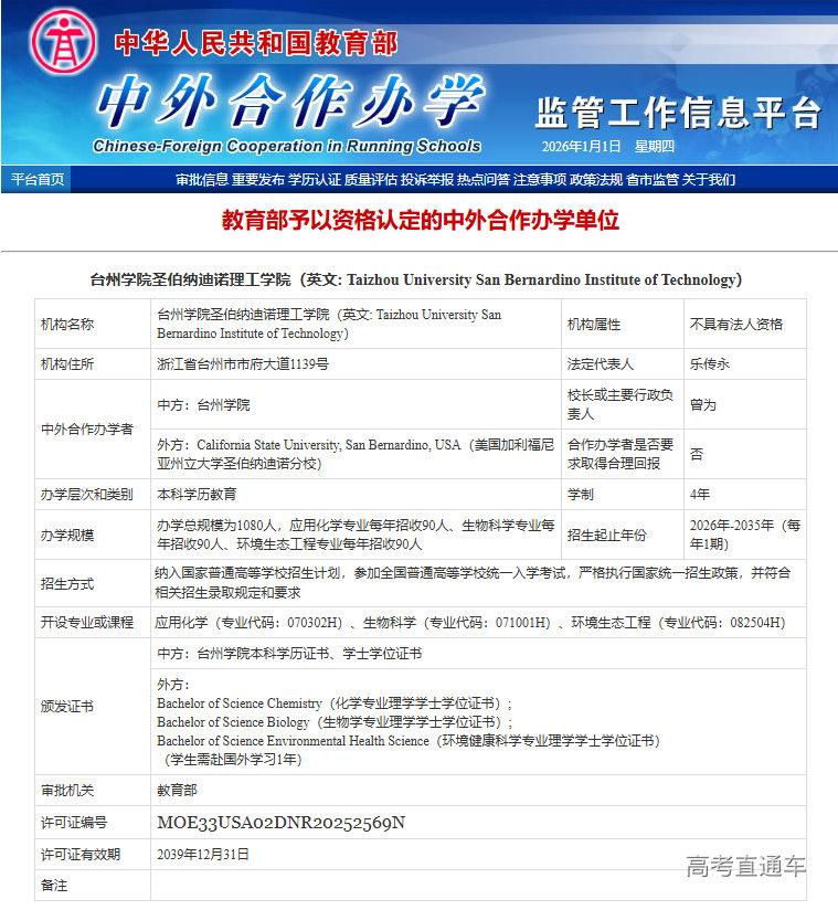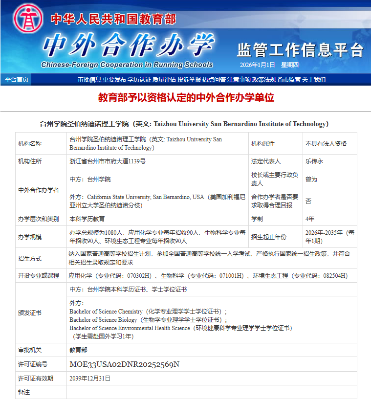 近日,教育部中外合作办学监管工作信息平台公布最新一批获资格认定的中外合作办学单位。我校与美国加州州立大学圣伯纳迪诺分校合作举办的“台州学院圣伯纳迪诺理工学院”正式获批设立(许可证编码MOE33USA02DNR20252569N),标志着学校在国际交流与合作领域实现重大突破,国际化办学迈入新阶段。