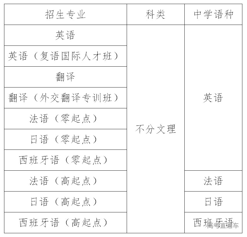 第六条经教育部批准具有推荐保送生资格的外国语中学中具备外语类保送生资格,符合当年高考报名条件,身心健康,品学兼优,德智体美劳全面发展,有志于从事外交外事、翻译、国际问题研究、涉外法律、经济、文化交流和国际传播工作的应届高中毕业生。