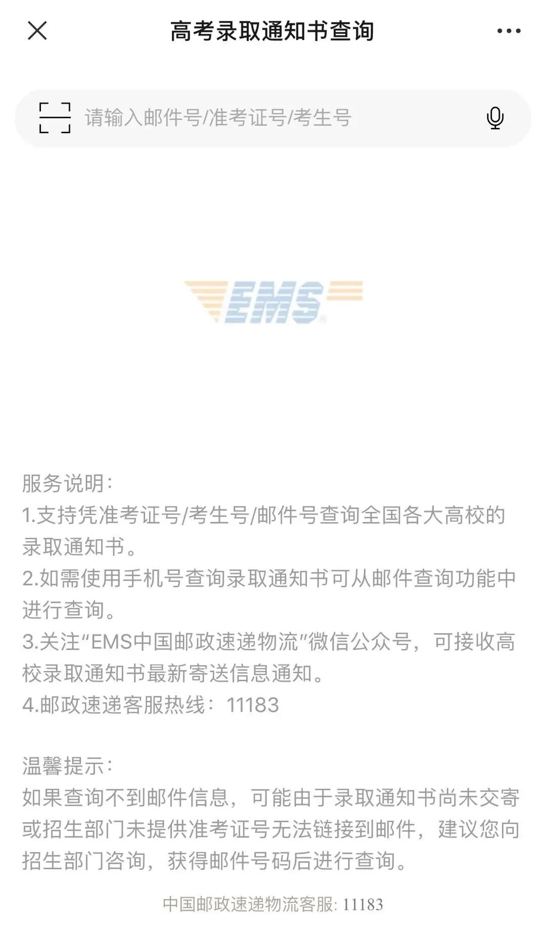 EMS速递信息查询: 通过关注“EMS中国邮政速递物流”微信公众号,点击“查件-录取通知书”,输入考生号(“2044开头”)即可实时关注录取通知书动态(查询方法如下)。
