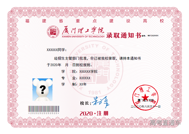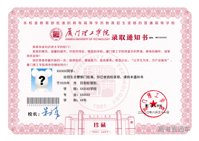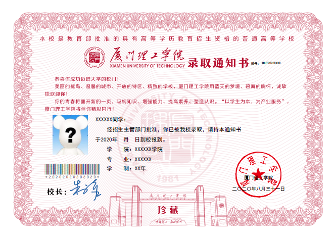 欢迎加入厦门理工学院大家庭!这一份期待已久的大学录取通知书,今天起分批寄出。请你带着长辈的殷切期望,带着自己的梦想,向含辛茹苦养育你近二十年的父母道声珍重,背上你的行囊准备出发!