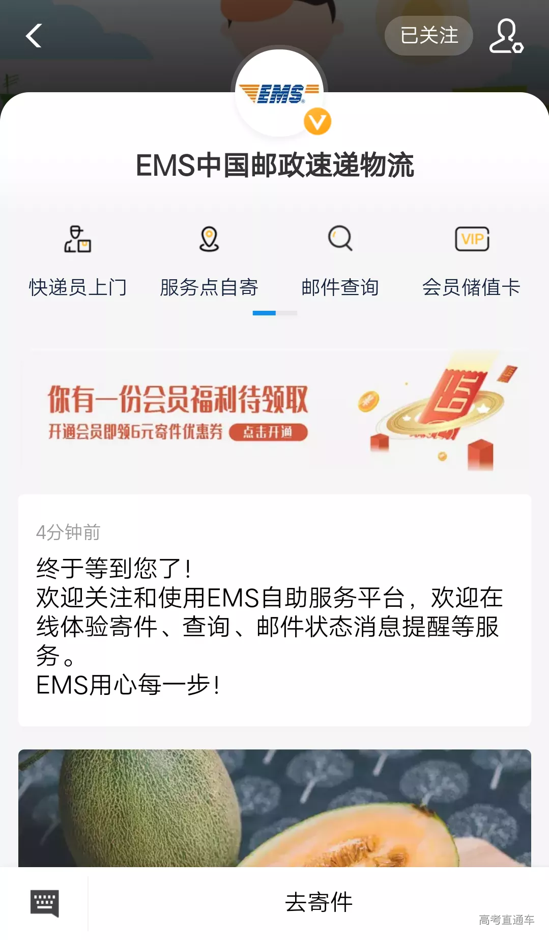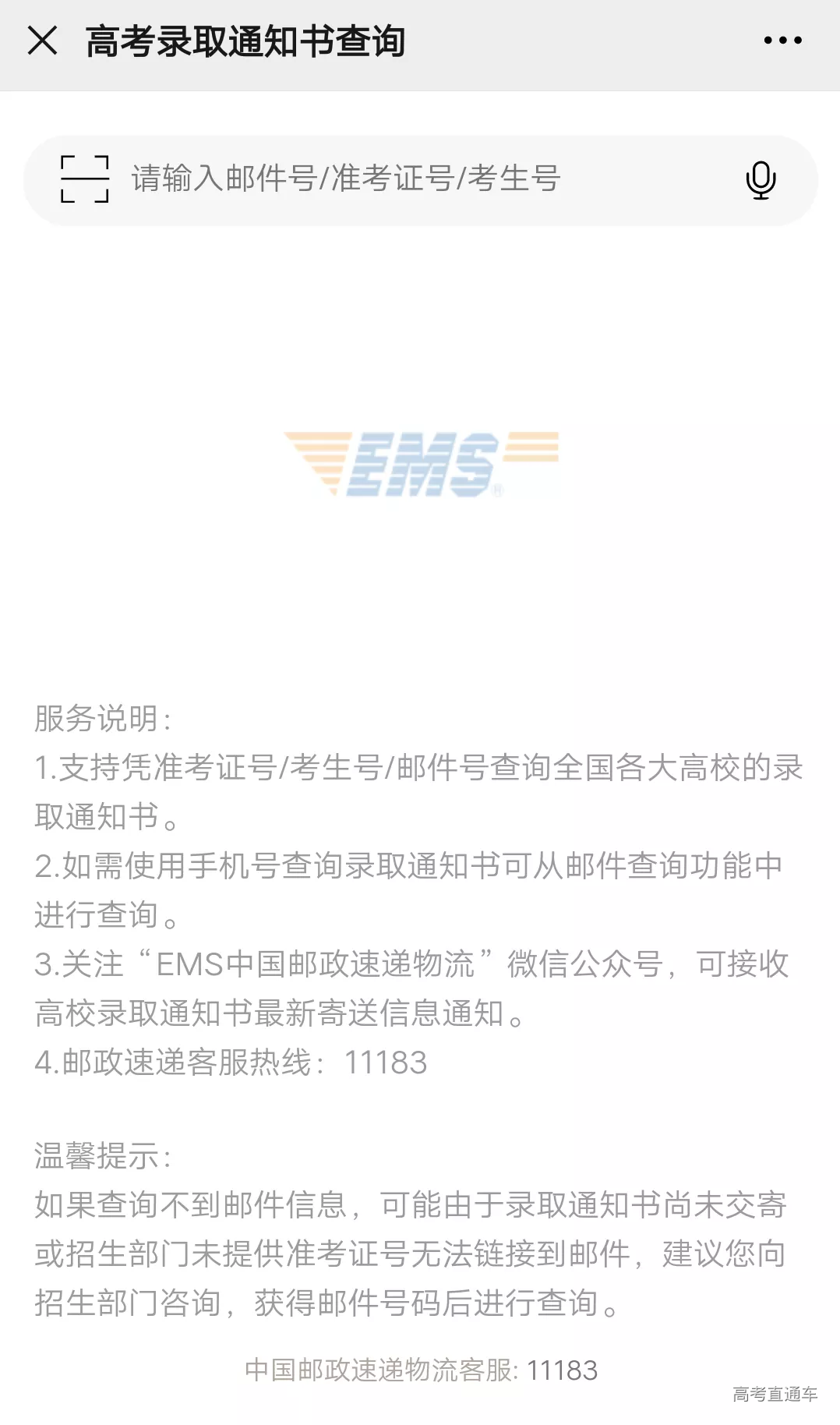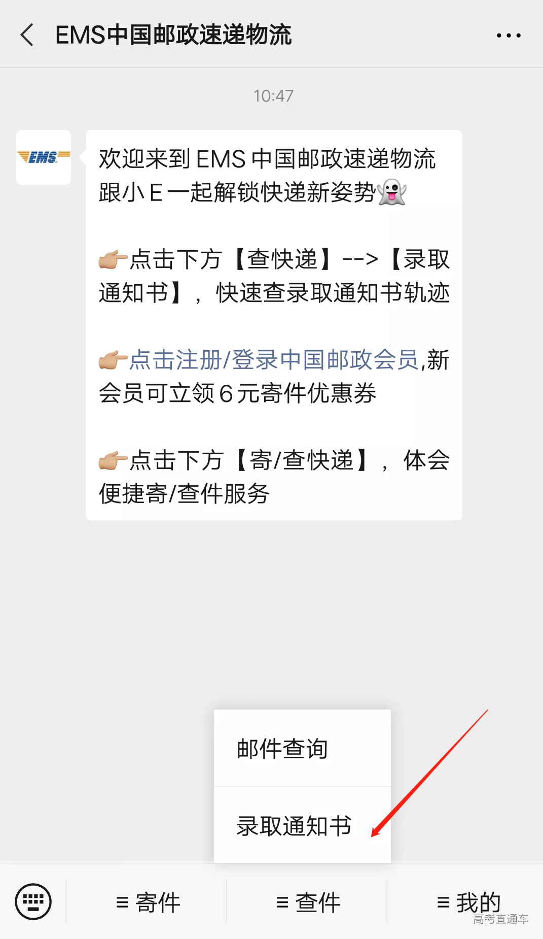 关注微信公众号 “EMS中国邮政速递物流” ,点击 “查件” 中的 “录取通知书” 。
