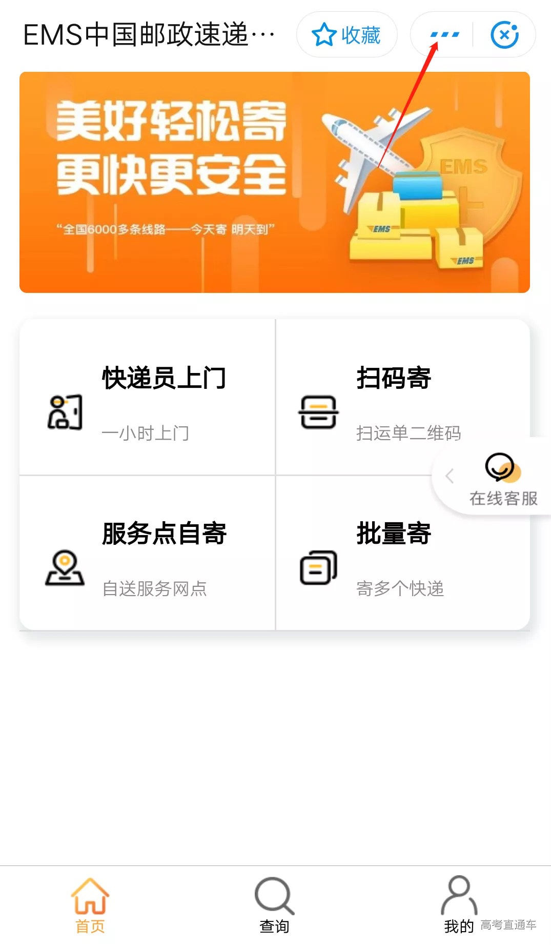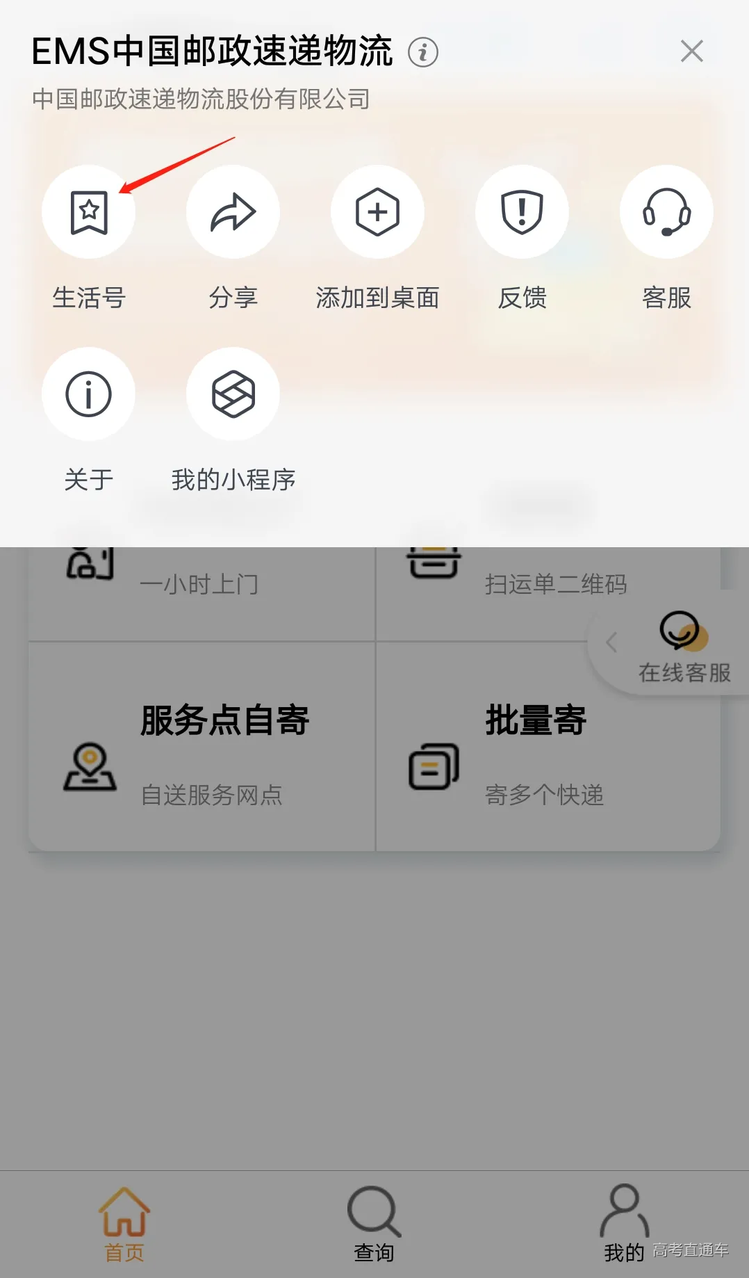 使用「EMS中国邮政速递物流」支付宝生活号通知书查询服务。点击EMS中国邮政速递物流右上角的省略号。