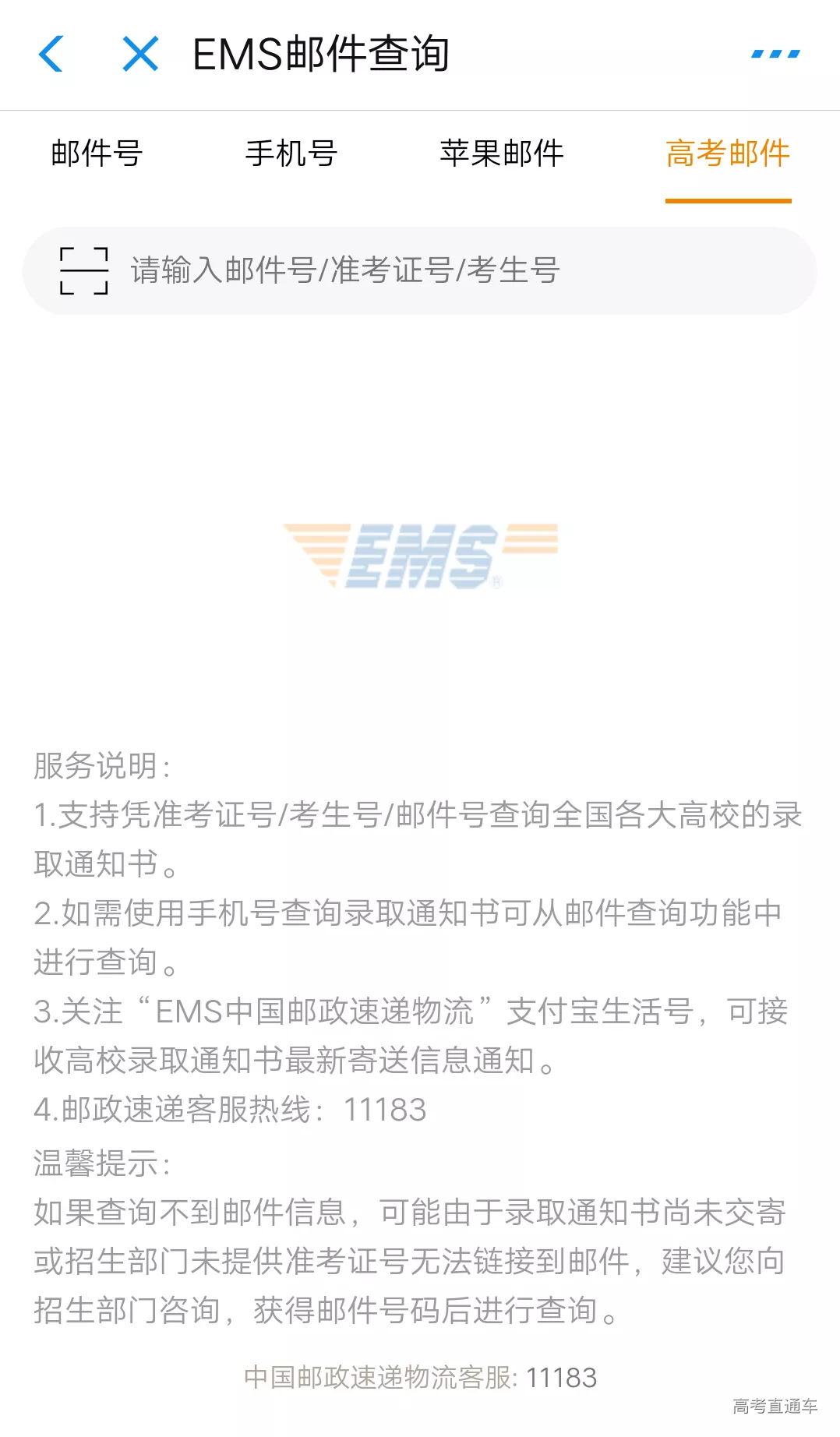 输入邮件号/准考证号/考生号,查询物流情况。