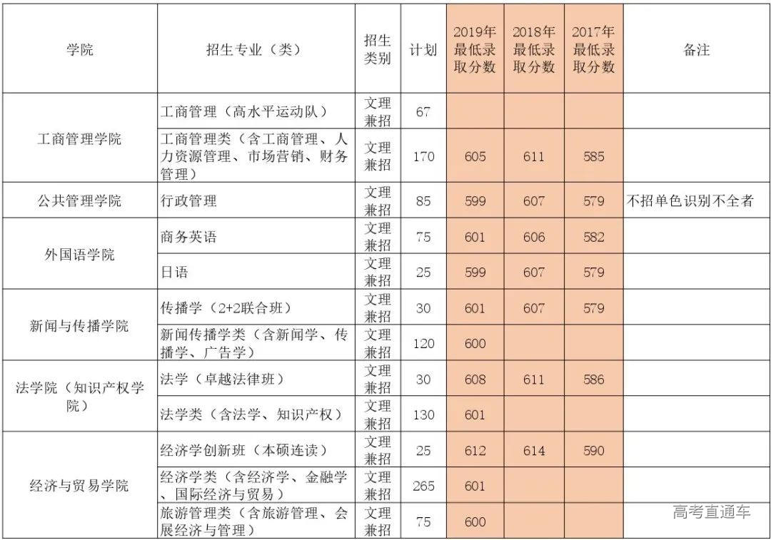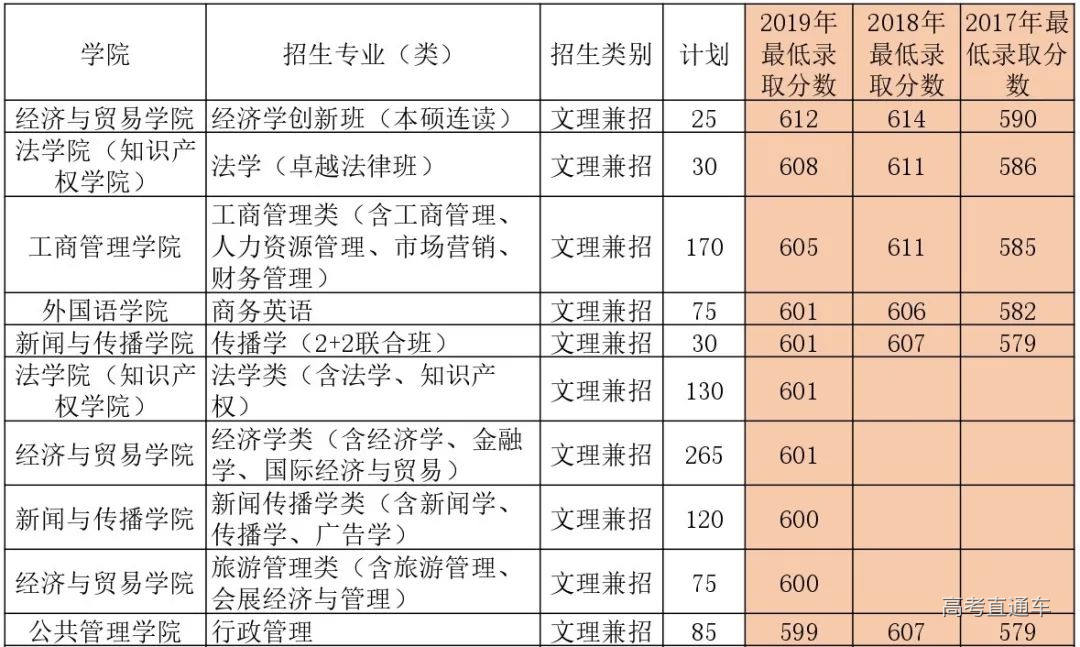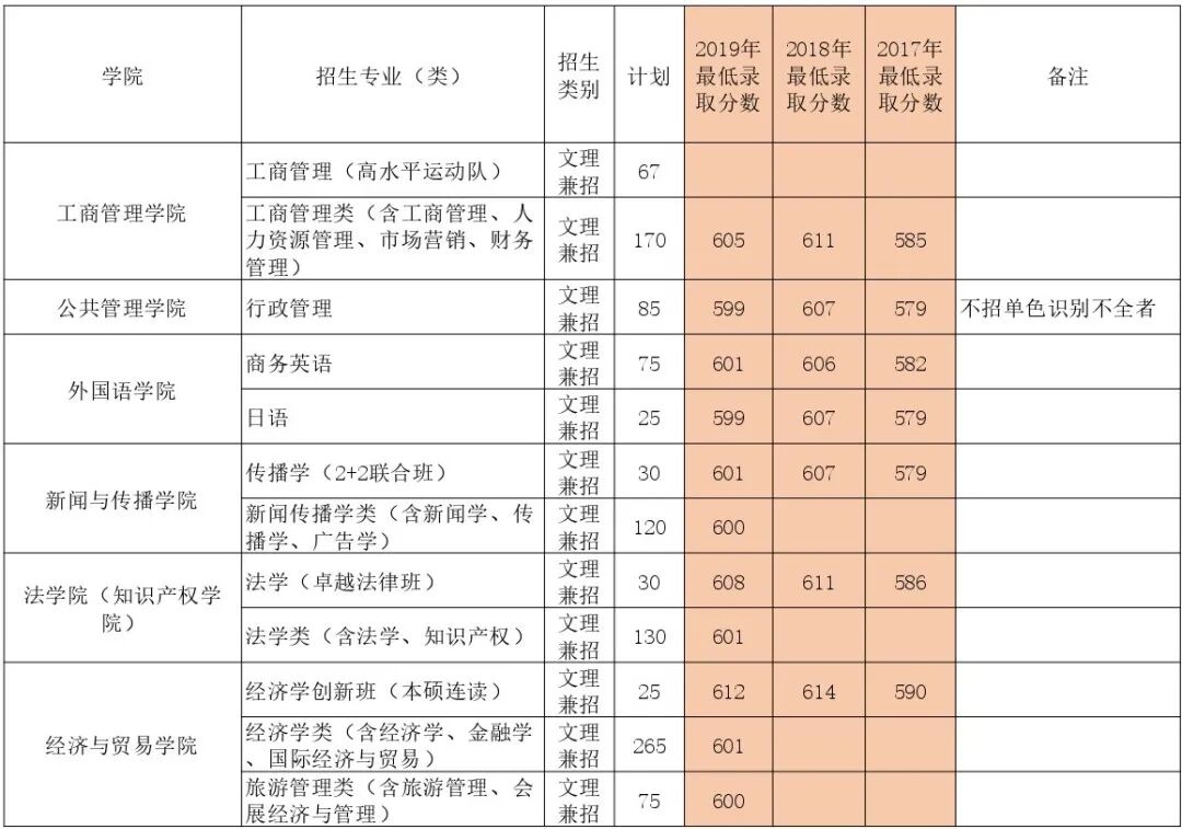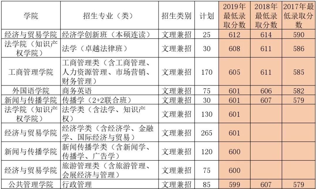 根据2019年的录取情况,录取分数最高的是经济学创新班(本硕连读),录取分为612分;录取分数最低的是日语专业,录取分为599分。