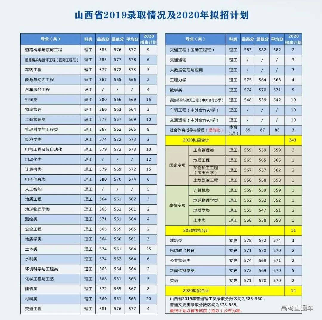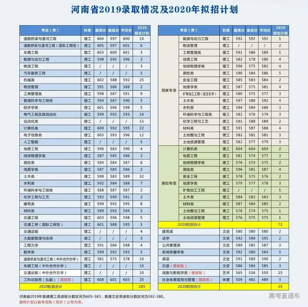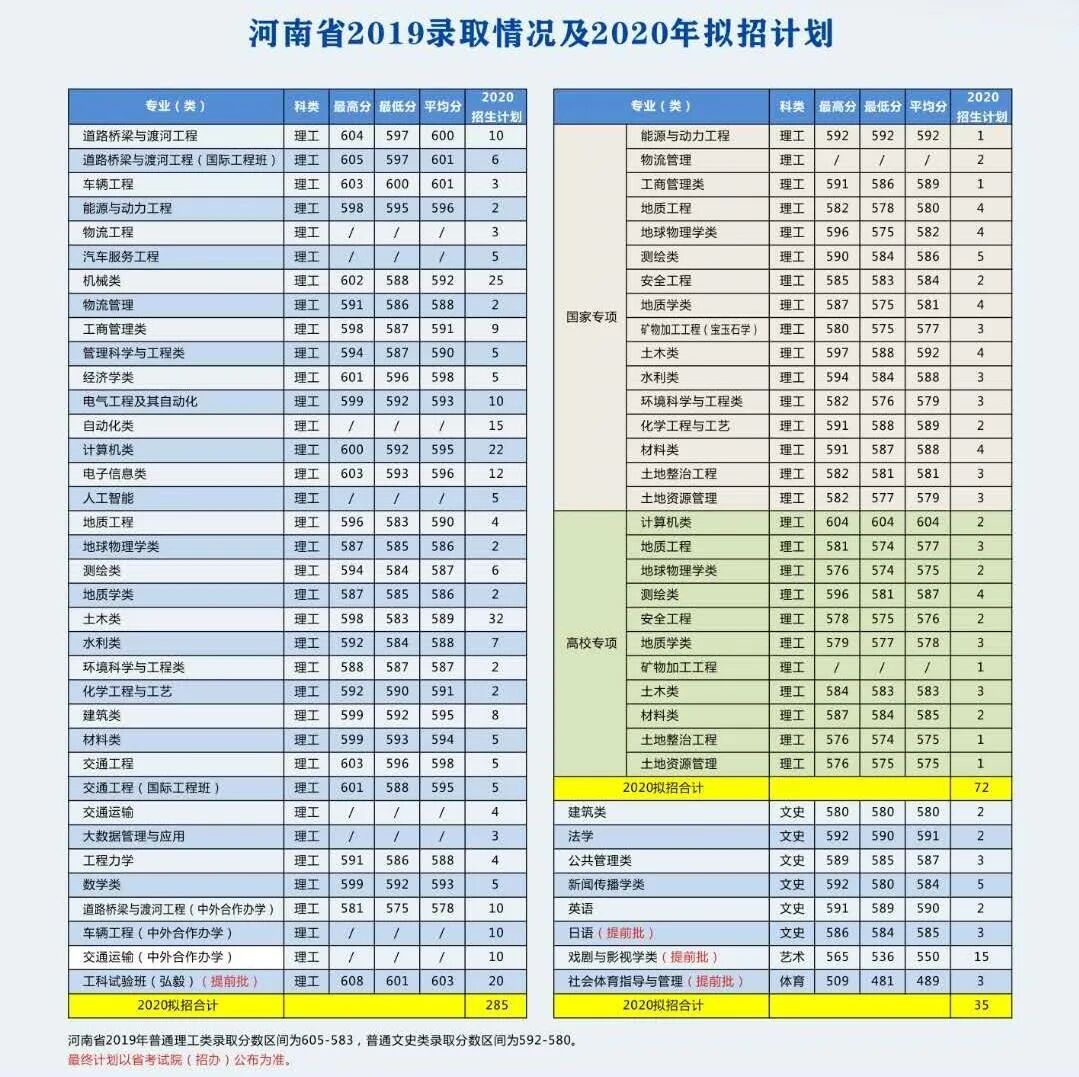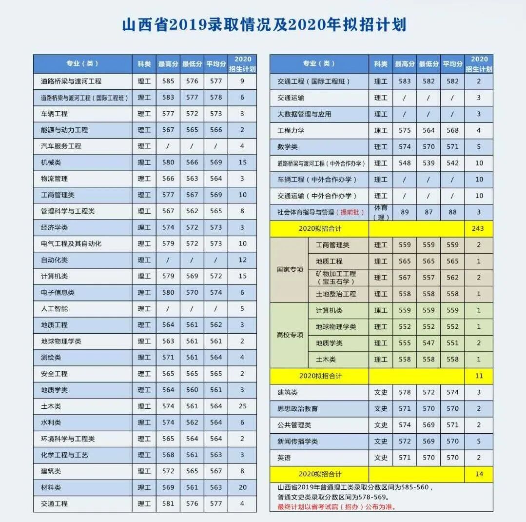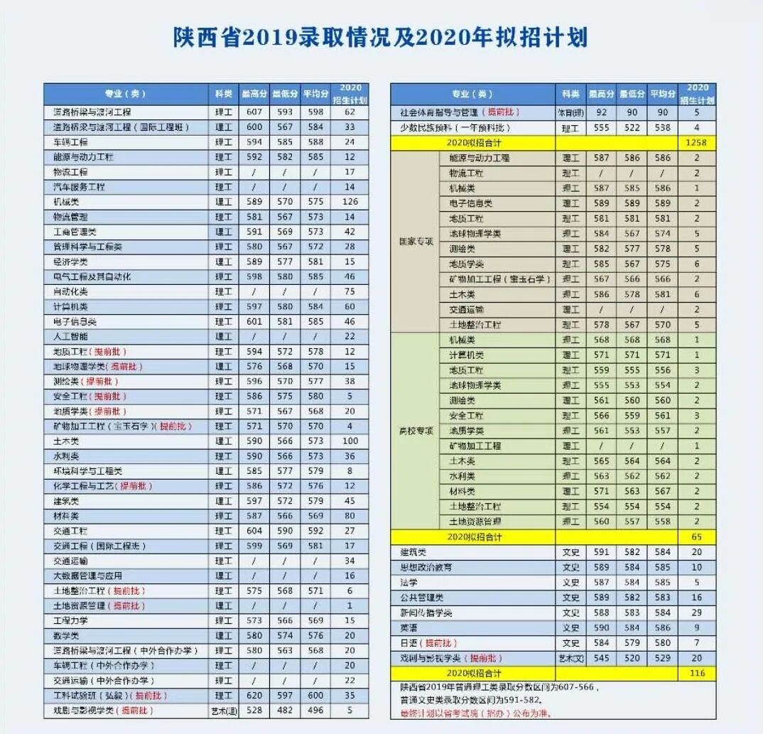 学校简介 长安大学直属国家教育部,是国家首批“211工程”重点建设大学、国家“985优势学科创新平台”建设高校、国家“双一流”建设高校。 学校坚持社会主义办学方向,紧扣立德树人根本任务,秉承“工科优势突出、理科基础深厚、文科繁荣发展”的学科布局,担当“人才培养的摇篮、科学研究的殿堂、社会服务的基地、文化传承创新的高地”的崇高使命,坚持“特色鲜明、国际知名的研究型大学”的目标愿景,成为我国交通运输、国土资源、城乡建设三大行业领域高层次人才培养、高水平科学研究、高质量社会服务的重要基地。 学校工程学、地球科学、材料科学、环境科学与生态学等4个学科进入ESI全球前1%。土木与交通学科雄居U.S.News全球大学第66名,被誉为公路交通人才培养的“黄埔军校”、科技创新的“金名片”。 学校位居历史文化名城西安,坐拥南北两大校区,南倚大雁塔,北邻渭水滨,建有太白山、梁山、渭水三个教学实习基地,校园面积3745亩。学校育人成果丰硕,累计向海内外输送优秀毕业生28万余人,其中外国留学生3000余人。 2019年录取情况及2020年拟招计划 特色培养 工科试验班(本硕分流、提前批次) 主要培养交通运输、国土资源、城乡建设三大行业,具有国际视野、创新能力的领军人才。学校集中优质师资保障教学质量,学生入校后实行通识教育、个性培养,三、四年级根据个人意愿自主选择专业,配备专业导师,可提前进入科研团队。毕业前符合学校相关管理规定,即可以获得免试攻读研究生资格(含我校直博生和公派出国留学)。 国际工程班(本科批次) 面对中国企业拓展海外工程项目的迫切需求,为“中国建造”培养具有跨文化管理能力和国际竞争力的复合创新型涉外高级工程技术人才。国际工程班涵盖学校传统优势专业(道路桥梁与渡河工程、交通工程),融入国际工程教育理念,开设国际工程项目特色课程,采用双语/全英文教学模式,学生就业优势强、选择方向多。 长安都柏林国际交通学院 我校与爱尔兰都柏林大学合作举办的非独立法人中外合作办学机构,以建设交通运输工程领域特色鲜明的国际化学院为目标,致力于培养在交通运输工程领域具有广阔国际视野、复杂工程问题解决能力和全球胜任力的复合型、创新型、“新工科+大交通+国际化”的高端技术管理人才。学院开设道路桥梁与渡河工程、车辆工程、交通运输3个中外合作办学专业,计划招生360人/年,实行