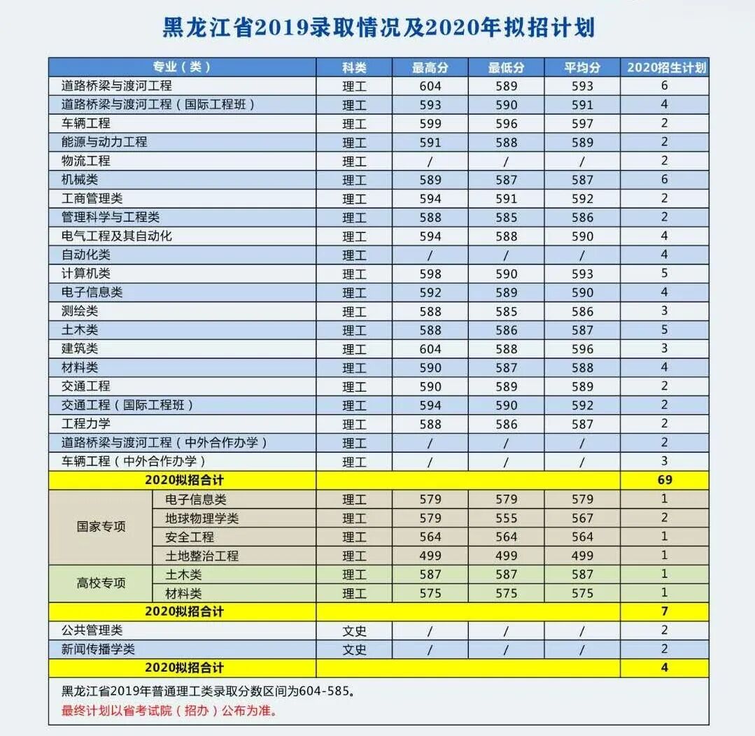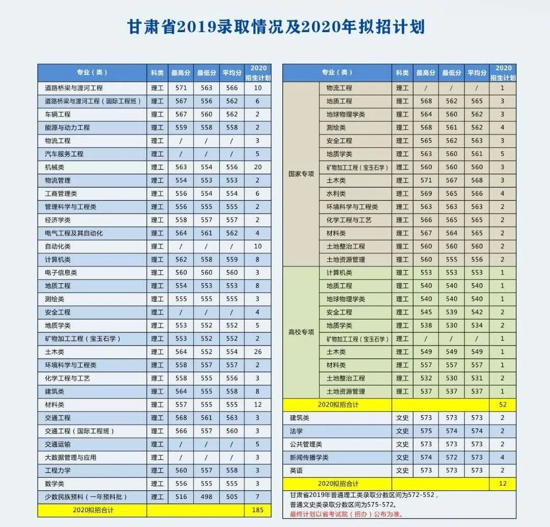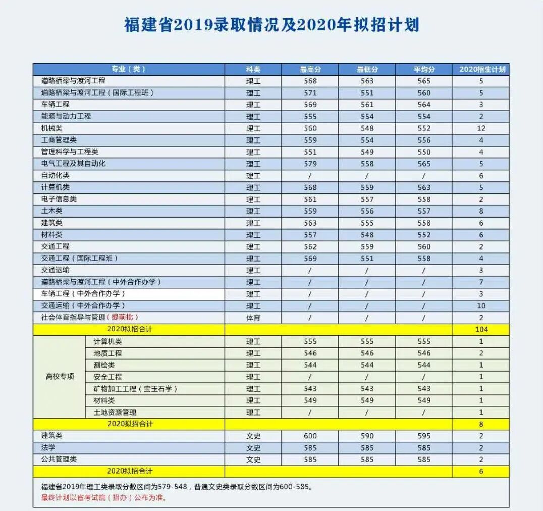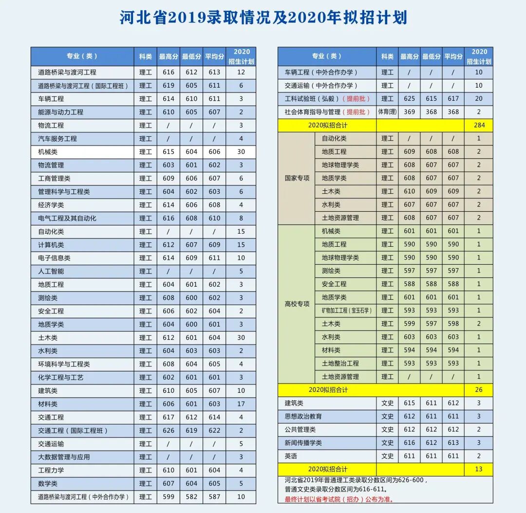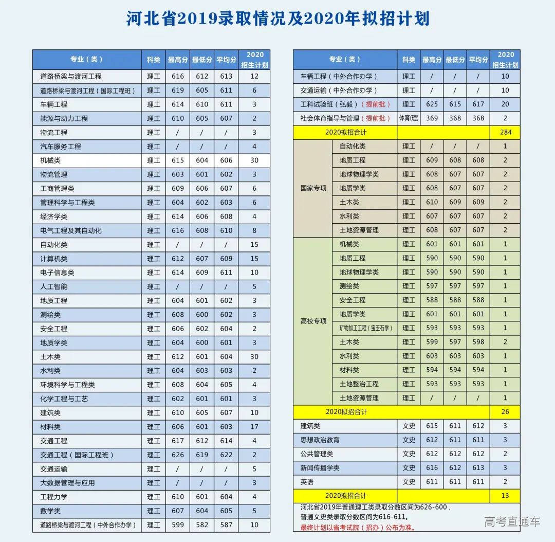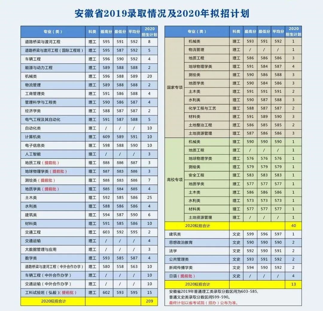 学校简介 长安大学直属国家教育部,是国家首批“211工程”重点建设大学、国家“985优势学科创新平台”建设高校、国家“双一流”建设高校。 学校坚持社会主义办学方向,紧扣立德树人根本任务,秉承“工科优势突出、理科基础深厚、文科繁荣发展”的学科布局,担当“人才培养的摇篮、科学研究的殿堂、社会服务的基地、文化传承创新的高地”的崇高使命,坚持“特色鲜明、国际知名的研究型大学”的目标愿景,成为我国交通运输、国土资源、城乡建设三大行业领域高层次人才培养、高水平科学研究、高质量社会服务的重要基地。 学校工程学、地球科学、材料科学、环境科学与生态学等4个学科进入ESI全球前1%。土木与交通学科雄居U.S.News全球大学第66名,被誉为公路交通人才培养的“黄埔军校”、科技创新的“金名片”。 学校位居历史文化名城西安,坐拥南北两大校区,南倚大雁塔,北邻渭水滨,建有太白山、梁山、渭水三个教学实习基地,校园面积3745亩。学校育人成果丰硕,累计向海内外输送优秀毕业生28万余人,其中外国留学生3000余人。 2019年录取情况及2020年拟招计划 特色培养 工科试验班(本硕分流、提前批次) 主要培养交通运输、国土资源、城乡建设三大行业,具有国际视野、创新能力的领军人才。学校集中优质师资保障教学质量,学生入校后实行通识教育、个性培养,三、四年级根据个人意愿自主选择专业,配备专业导师,可提前进入科研团队。毕业前符合学校相关管理规定,即可以获得免试攻读研究生资格(含我校直博生和公派出国留学)。 国际工程班(本科批次) 面对中国企业拓展海外工程项目的迫切需求,为“中国建造”培养具有跨文化管理能力和国际竞争力的复合创新型涉外高级工程技术人才。国际工程班涵盖学校传统优势专业(道路桥梁与渡河工程、交通工程),融入国际工程教育理念,开设国际工程项目特色课程,采用双语/全英文教学模式,学生就业优势强、选择方向多。 长安都柏林国际交通学院 我校与爱尔兰都柏林大学合作举办的非独立法人中外合作办学机构,以建设交通运输工程领域特色鲜明的国际化学院为目标,致力于培养在交通运输工程领域具有广阔国际视野、复杂工程问题解决能力和全球胜任力的复合型、创新型、“新工科+大交通+国际化”的高端技术管理人才。学院开设道路桥梁与渡河工程、车辆工程、交通运输3个中外合作办学专业,计划招生360人/年,实行