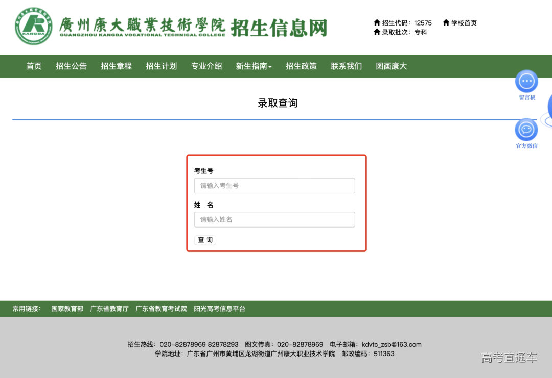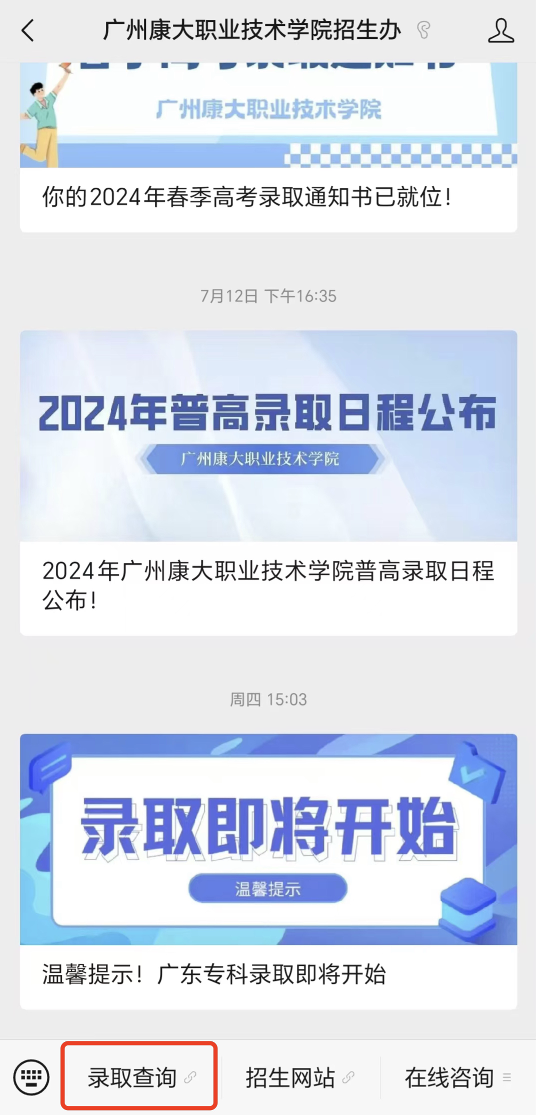 录取查询 一、考生可关注省教育考试院微信公众号,在页面底部选择“小程序”栏,通过考生号和密码登录即可查询考生录取结果。 二、省教育考试院将通过号码10639678或10692315731向已录取考生在高考志愿填报系统绑定的手机号码推送录取结果。 三、通过百度App搜索“广东省教育考试院”,打开“广东省教育考试院—官方小程序”,点击“录取结果”,按栏目指引即可查询录取结果。 四、考生可以通过“粤省事”小程序查询录取结果。具体操作为:在“粤省事”小程序中选择“教育服务”,点击“高考录取结果查询”,填写考生信息并核验通过后,即可查询录取结果。 五、关注学院招生办官方微信公众号(kdvtc12575),点击进入公众号,找到下方【录取查询】。 六、在广州康大职业技术学院招生信息网(https://zsb.kdvtc.edu.cn)进行查询。 2024 x KANG DA