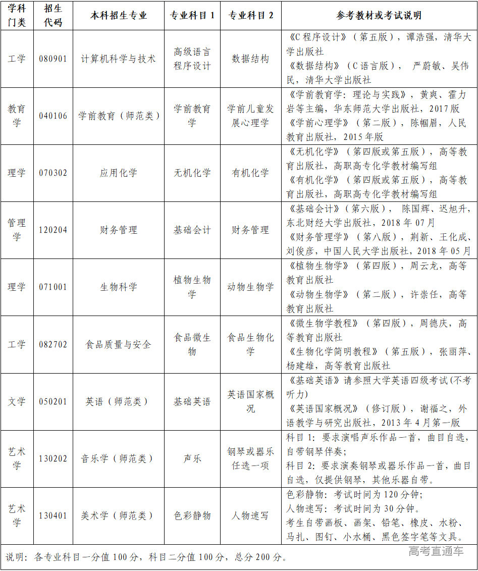 1.普通类专业采用笔试形式测试。包括计算机科学与技术、学前教育(师范类)、应用化学、财务管理、生物科学、食品质量与安全、英语(师范类)等专业。