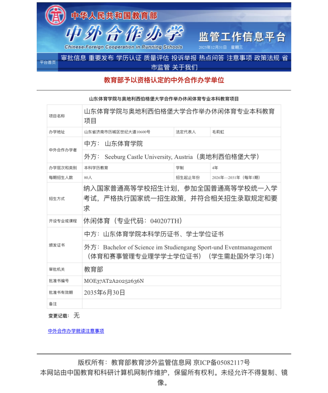 12月31日,山东体育学院与奥地利西伯格堡大学合作举办的休闲体育专业本科教育项目,正式通过教育部资格认定并在中外合作办学监管工作信息平台公布。这是我校首个获批的中外合作办学项目,也是山东省首个休闲体育专业本科层次中外合作教育项目。