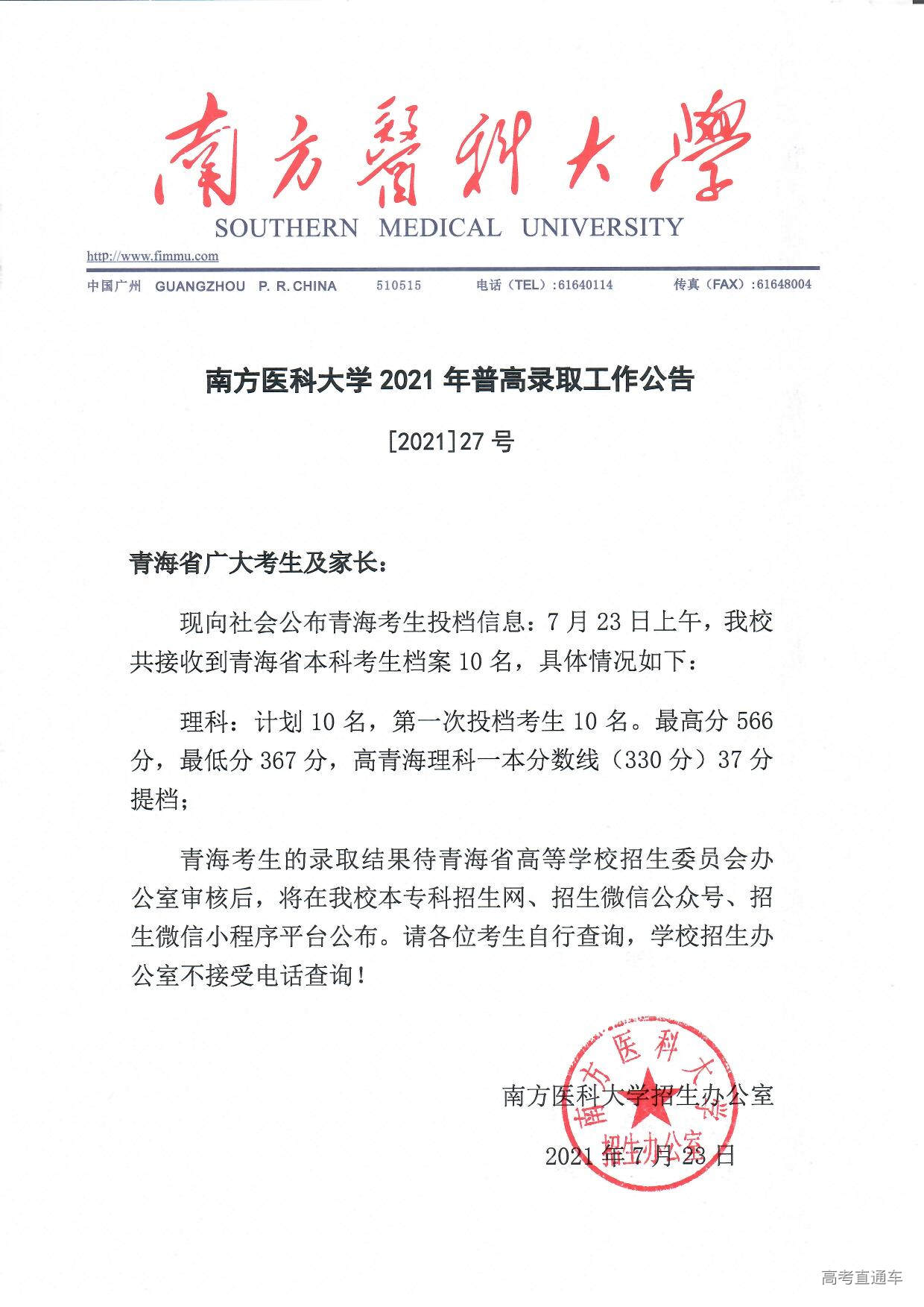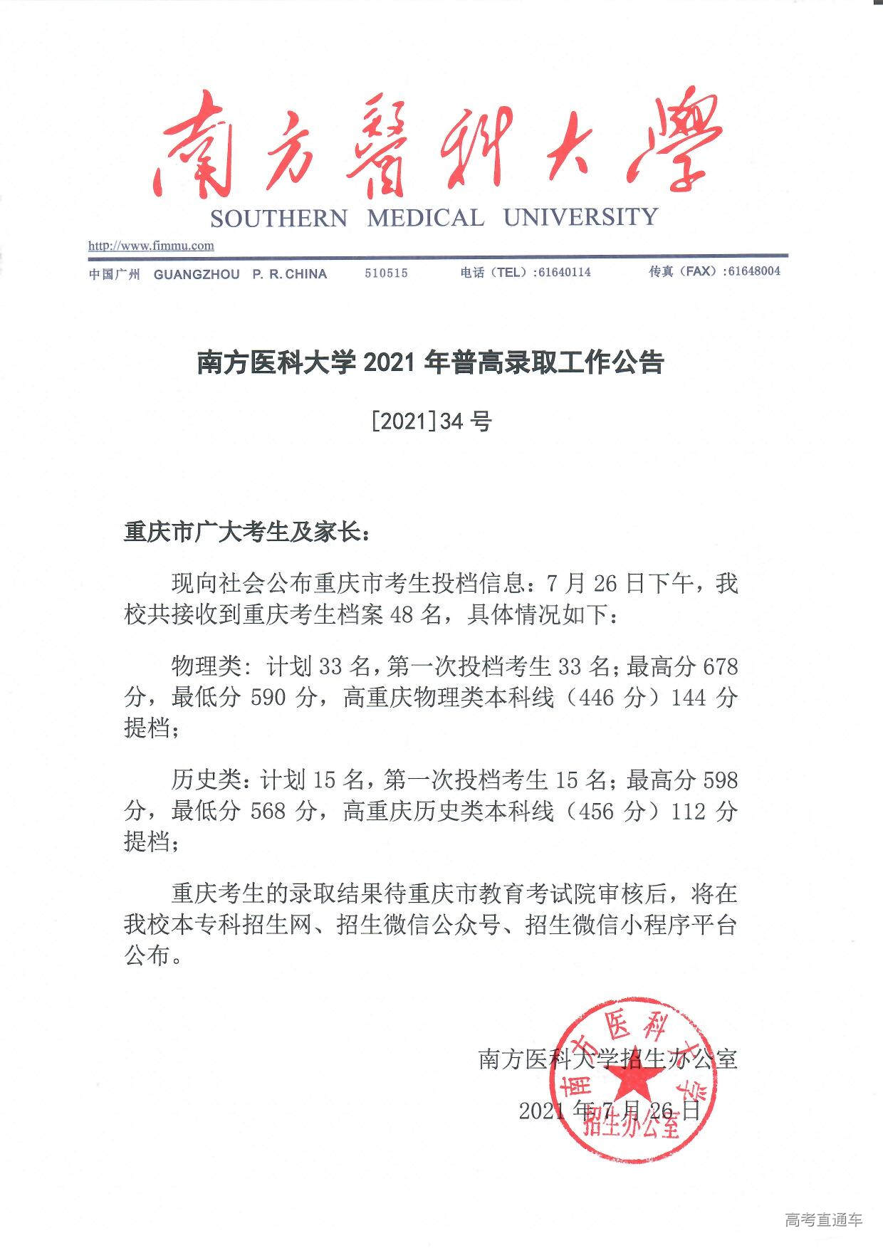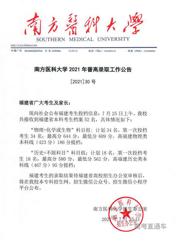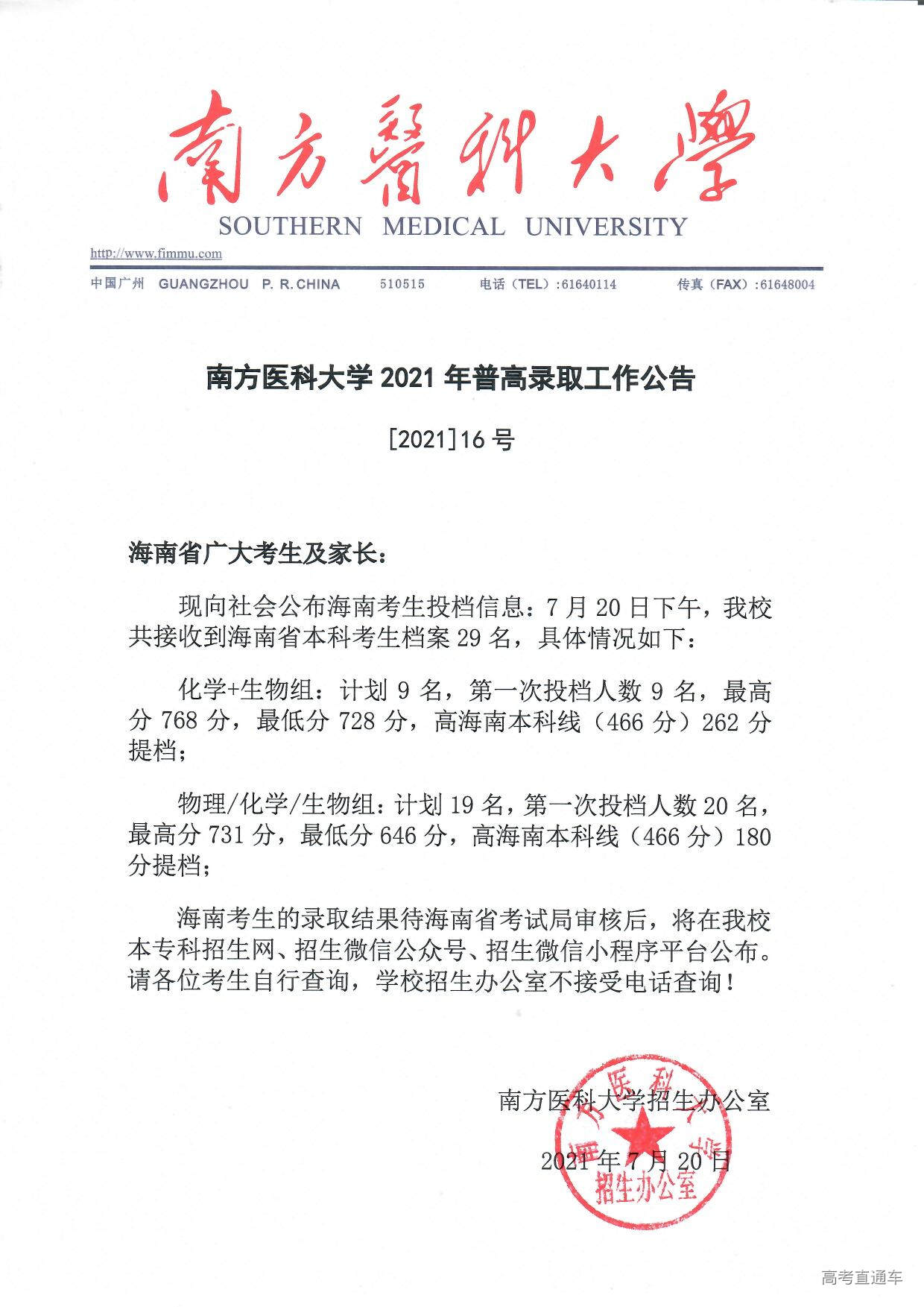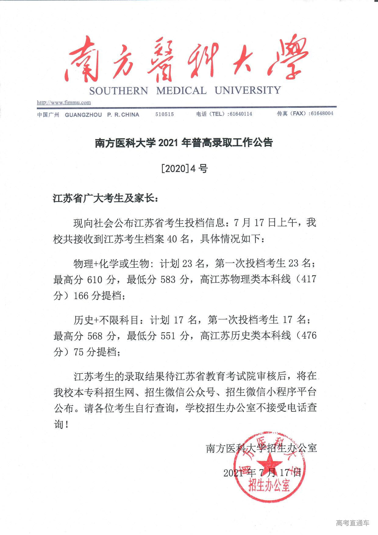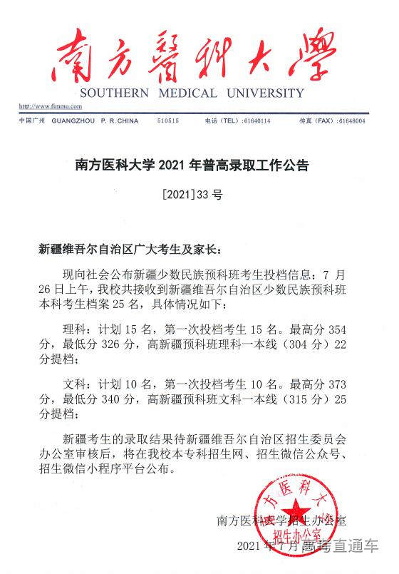 南方医科大学2021年普高录取工作公告【1号】