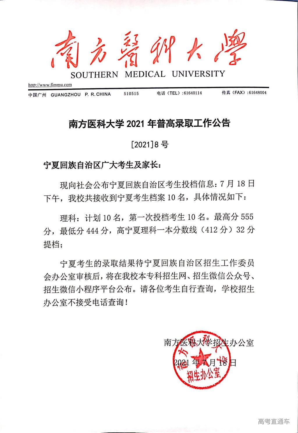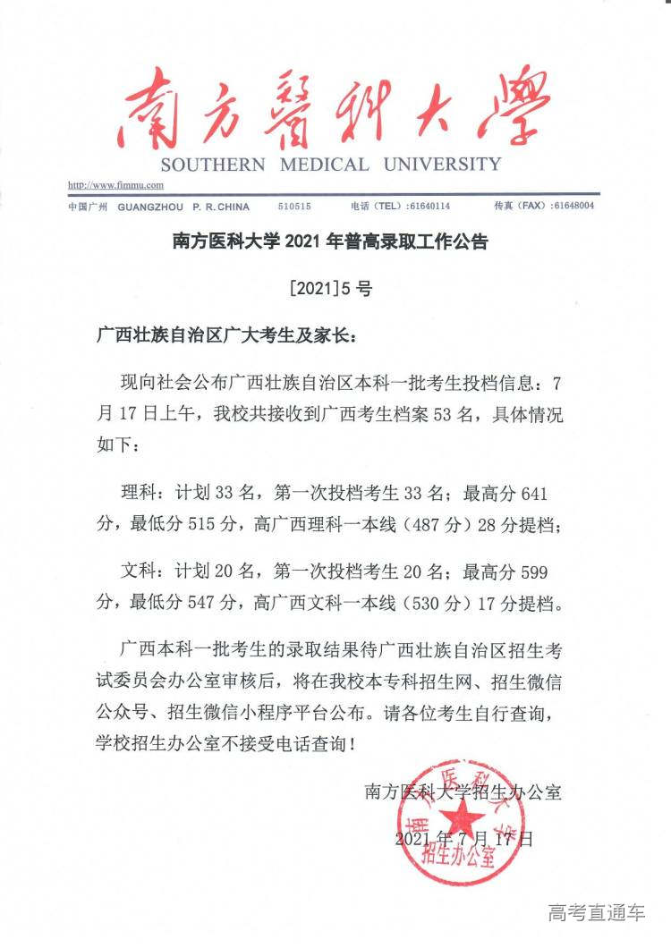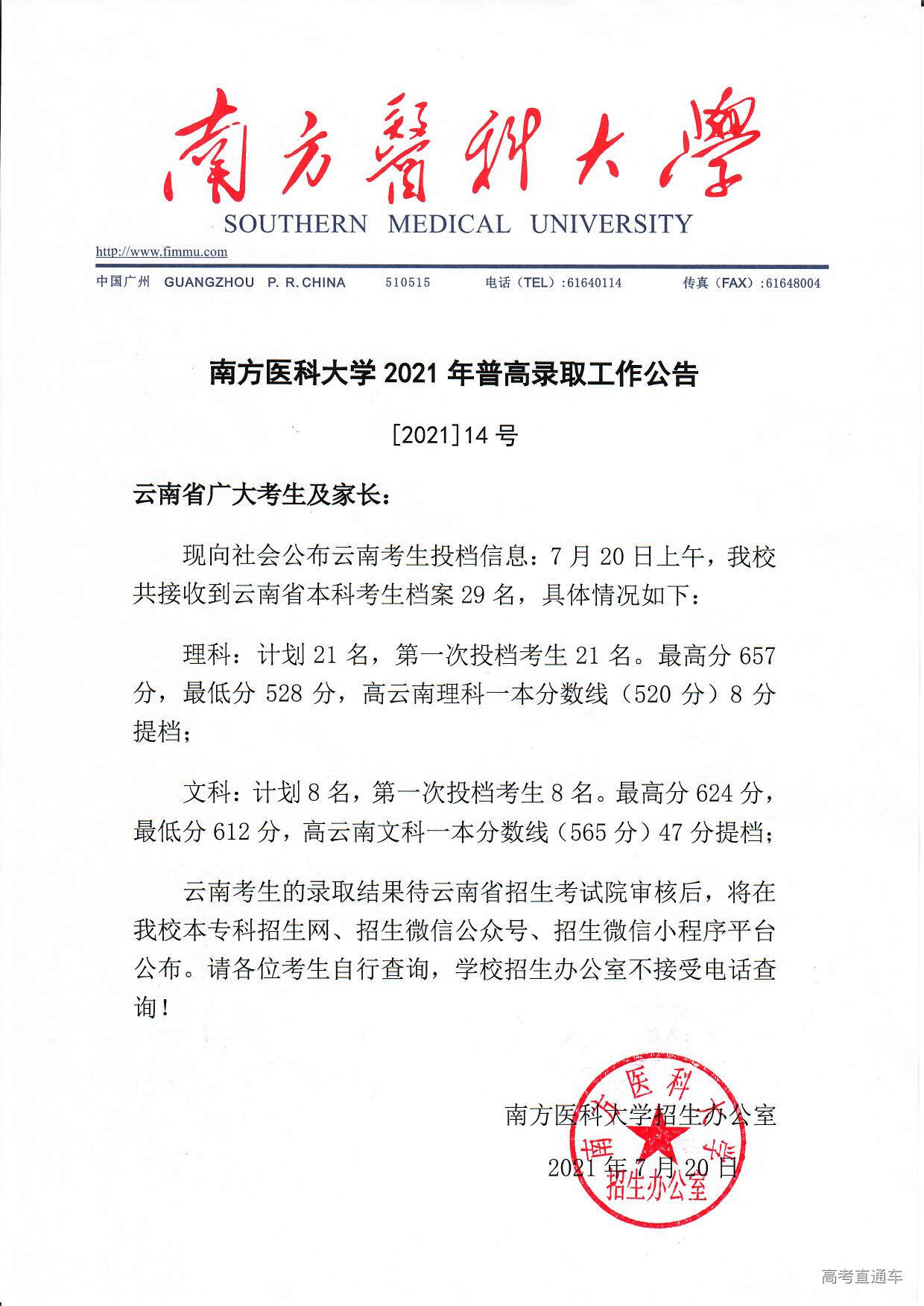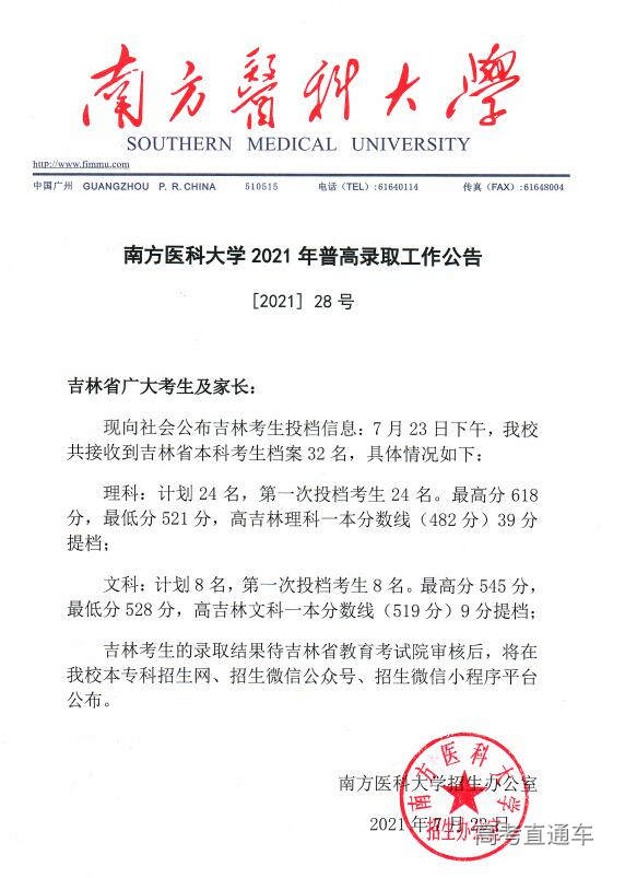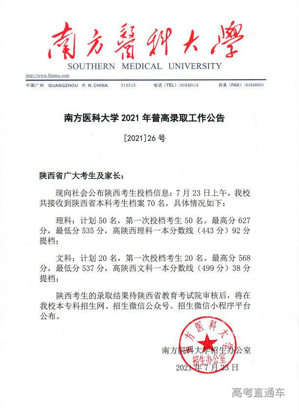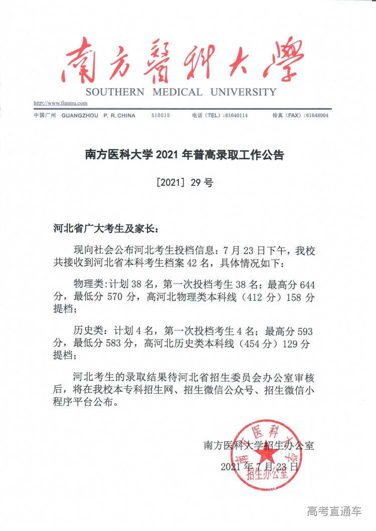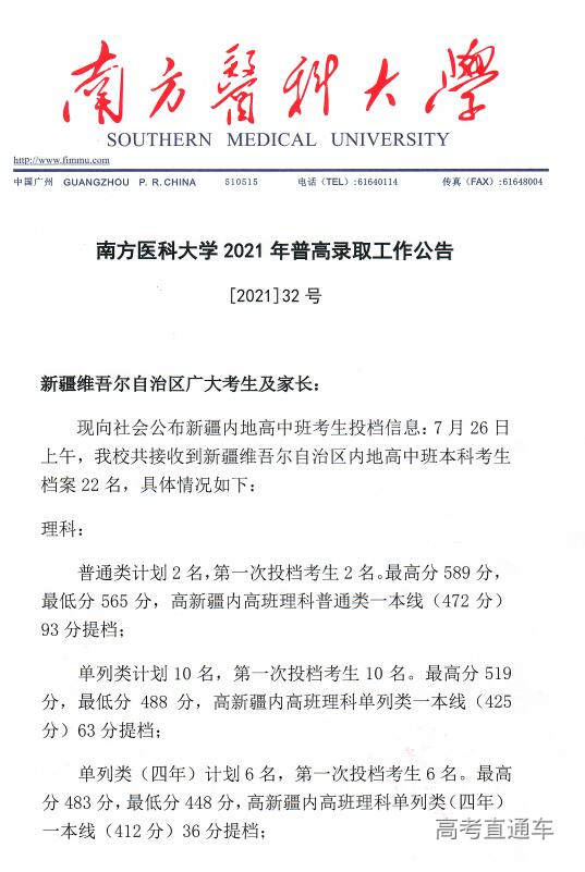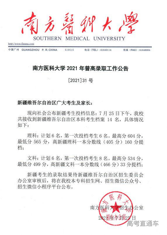 南方医科大学2021年普高录取工作公告【1号】