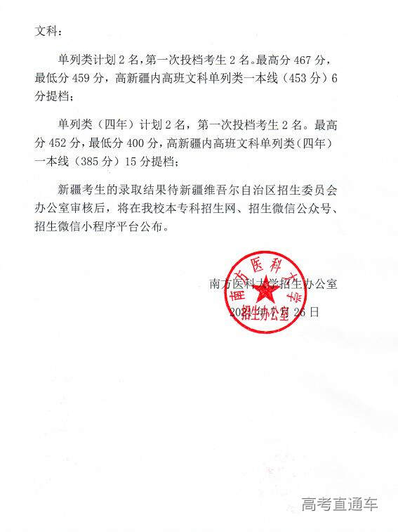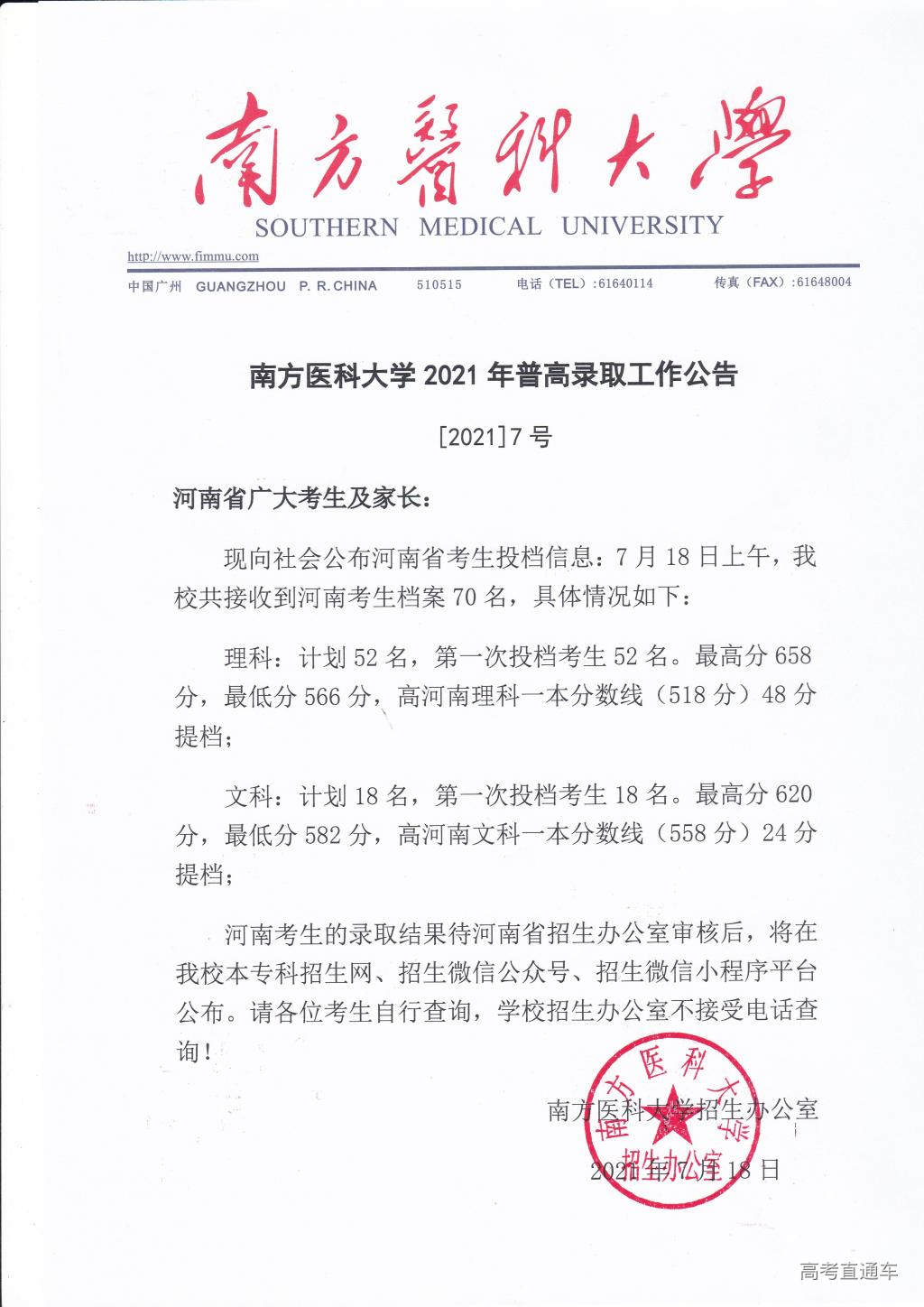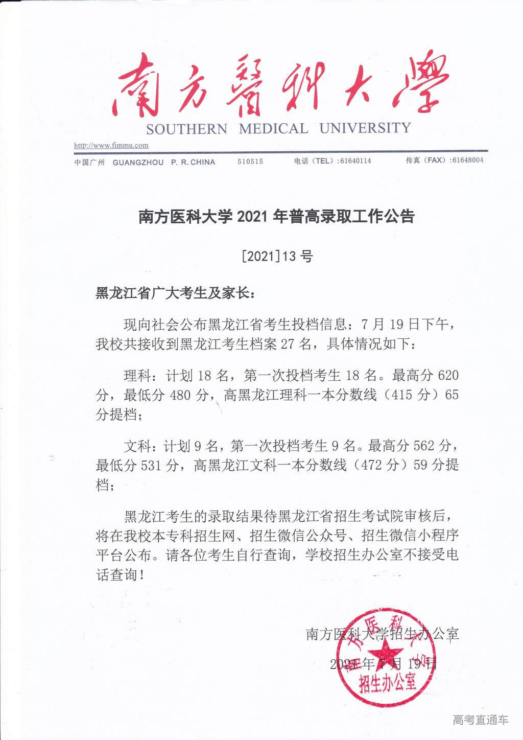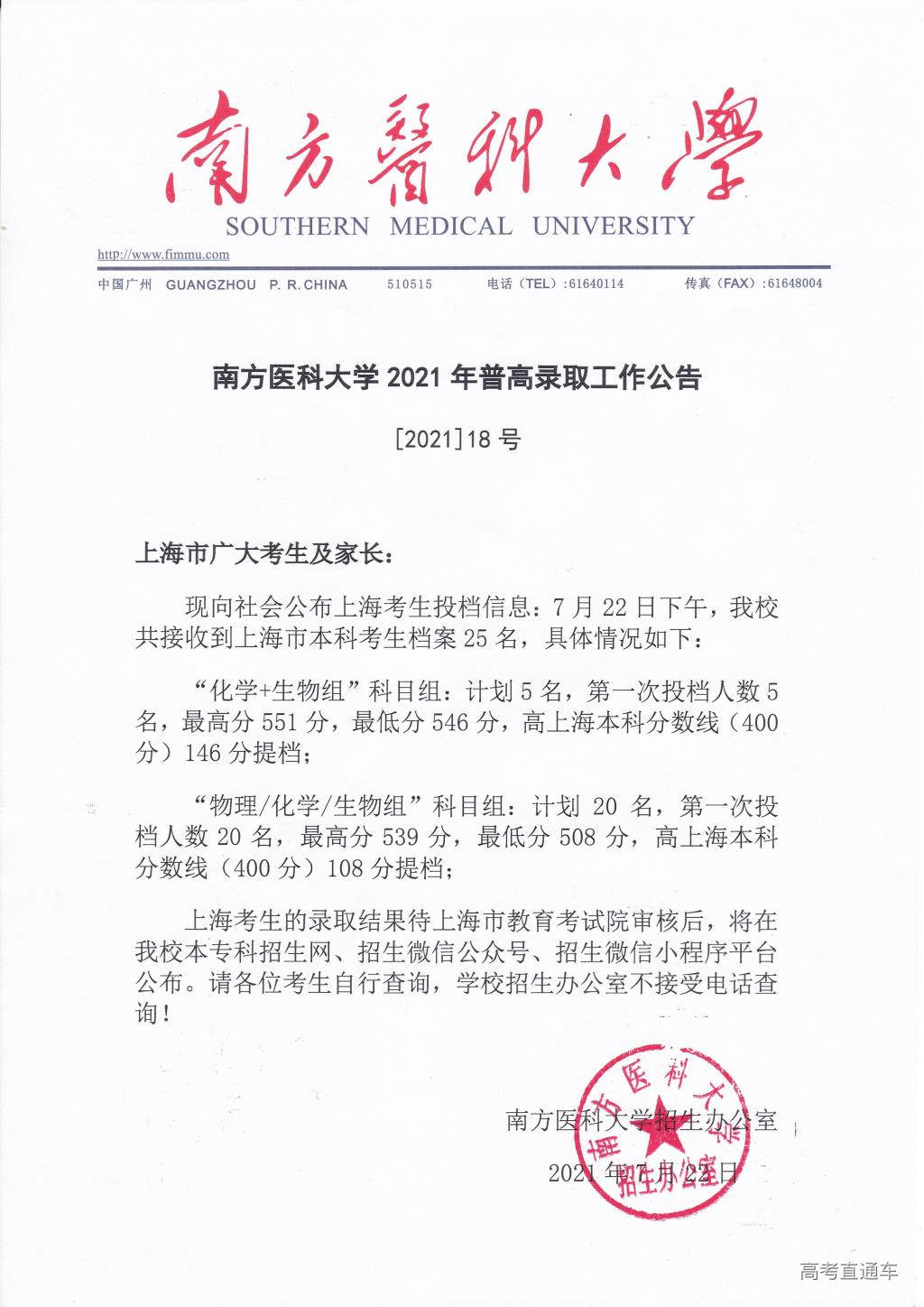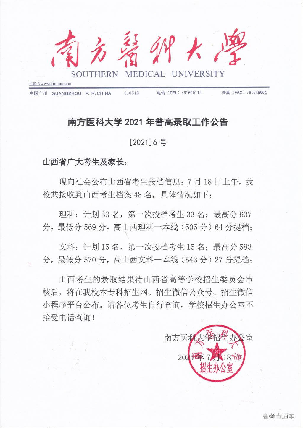 南方医科大学2021年普高录取工作公告【1号】
