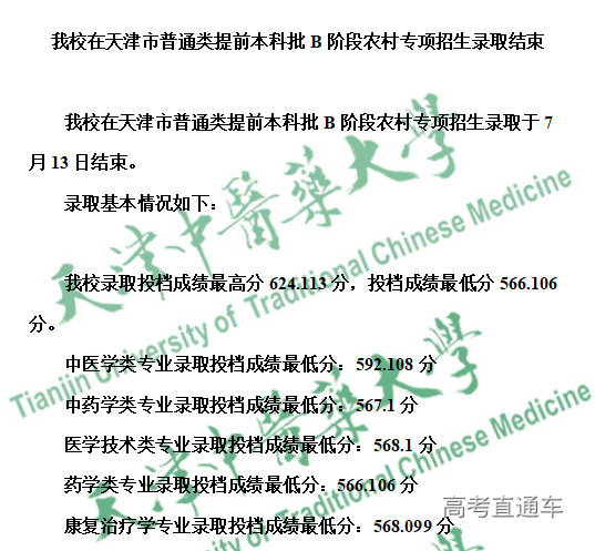 天津中医药大学2024在天津市普通类提前本科批B阶段农村专项招生录取结束
