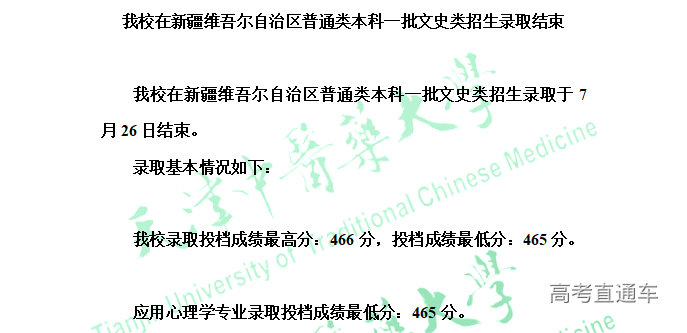 天津中医药大学新疆普通类本科一批文史类招生录取结果