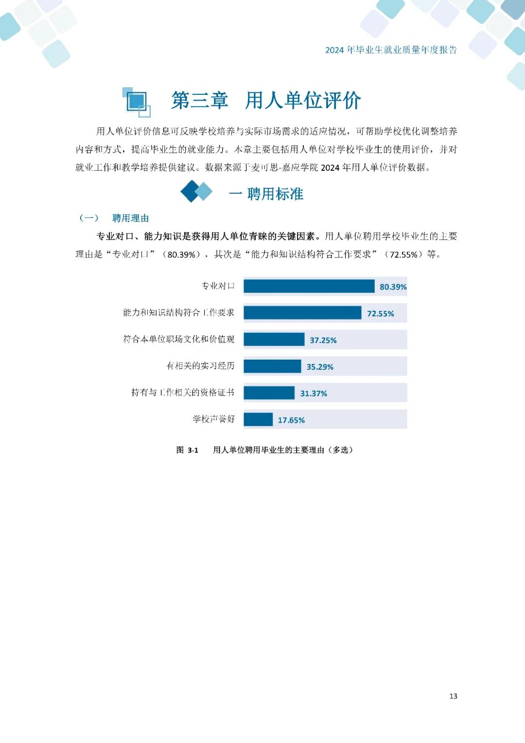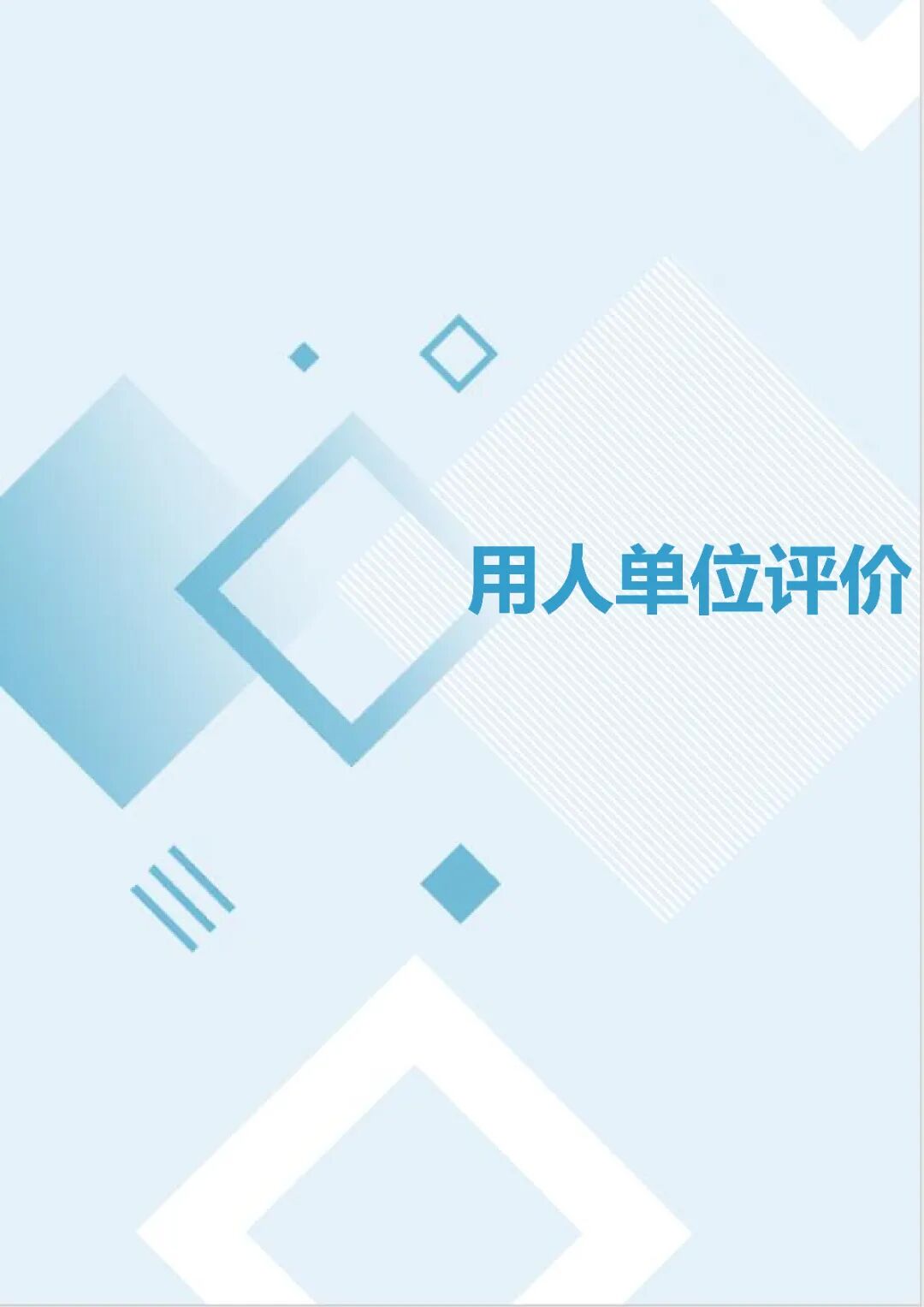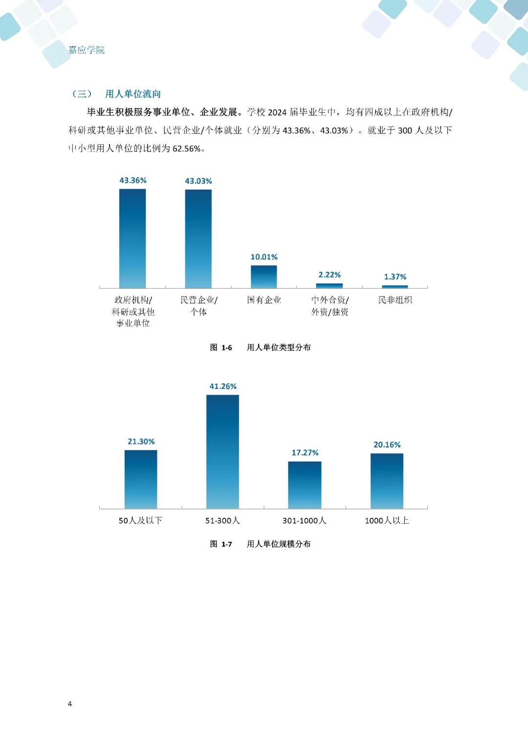 用人单位:政府机构/科研或其他事业单位(43.36%)、民营企业/个体(43.03%)、国有企业(10.01%)。就业于300人及以下中小型用人单位的比例为 62.56%。