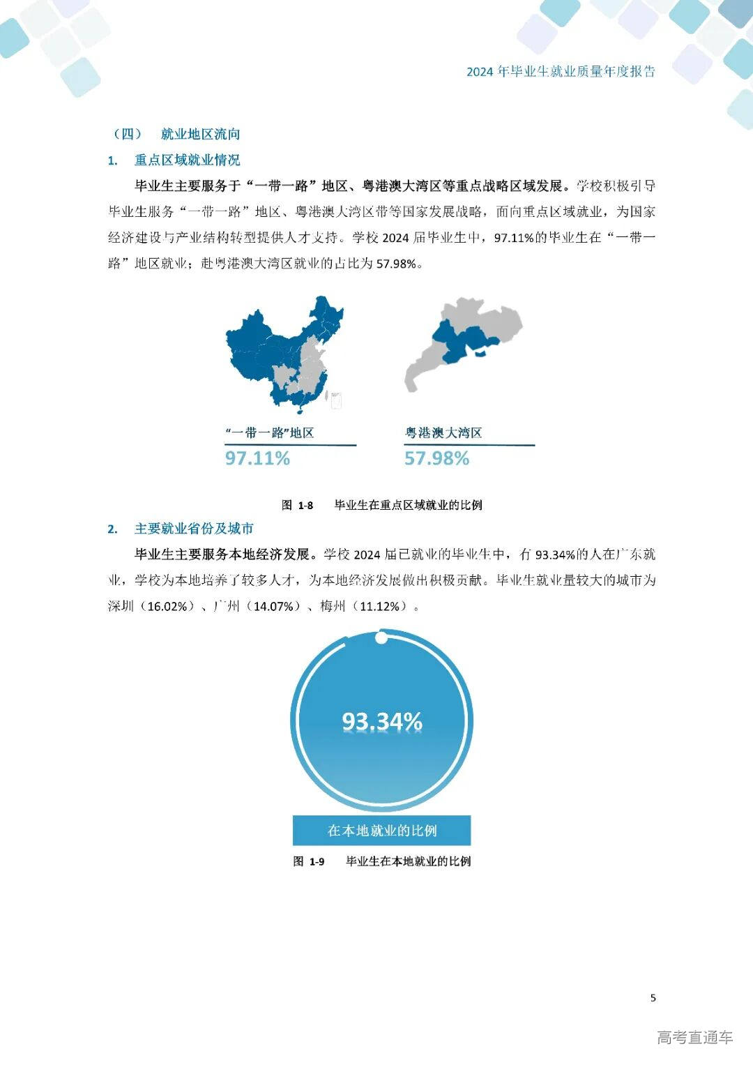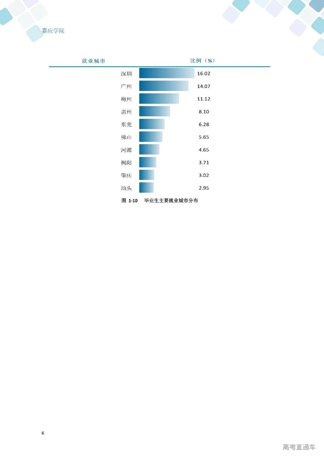 省内就业城市Top5:深圳市(16.02%)、广州市(14.07%)、梅州市(11.12%)、惠州市(8.10%)、东莞市(6.28%)。