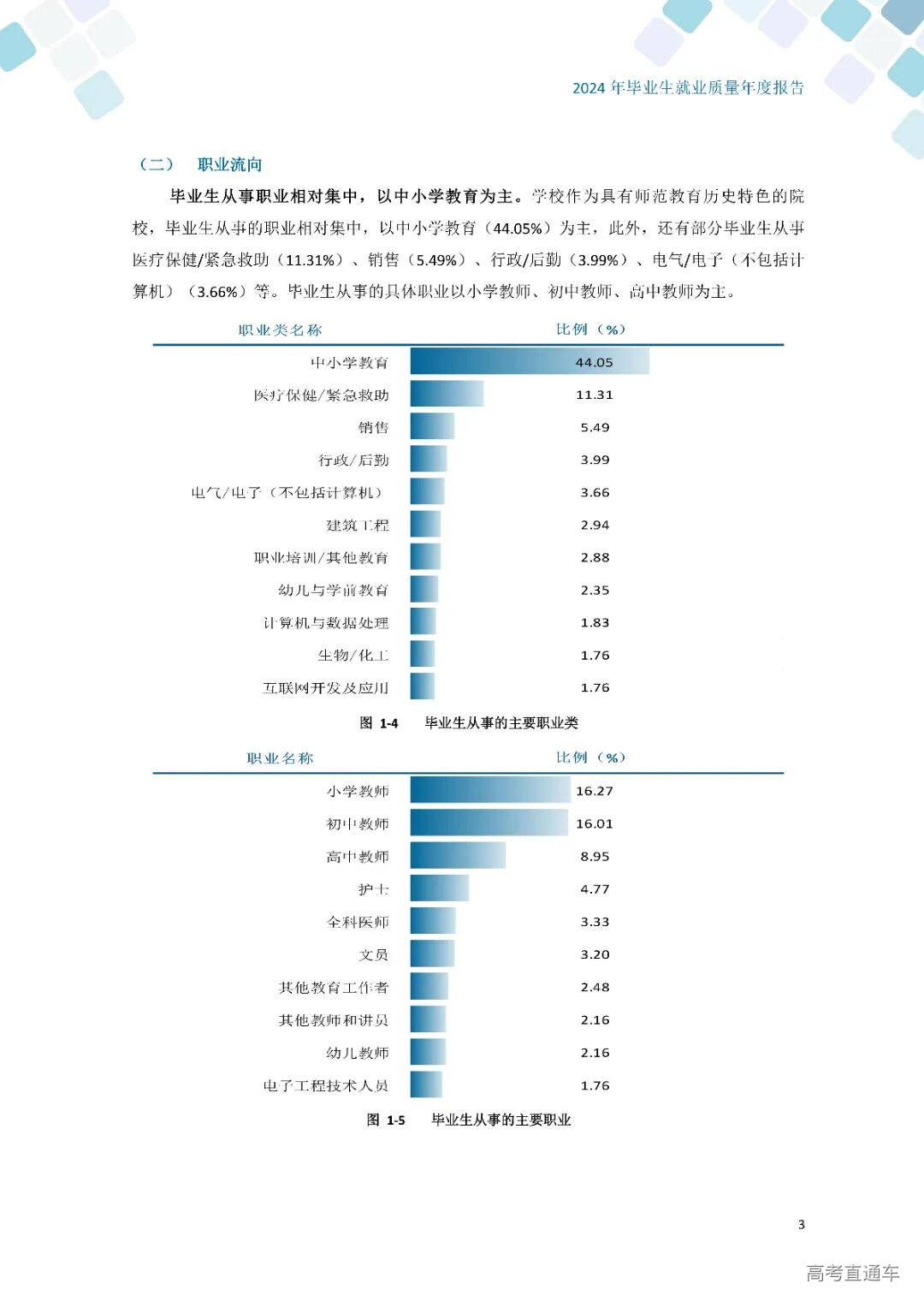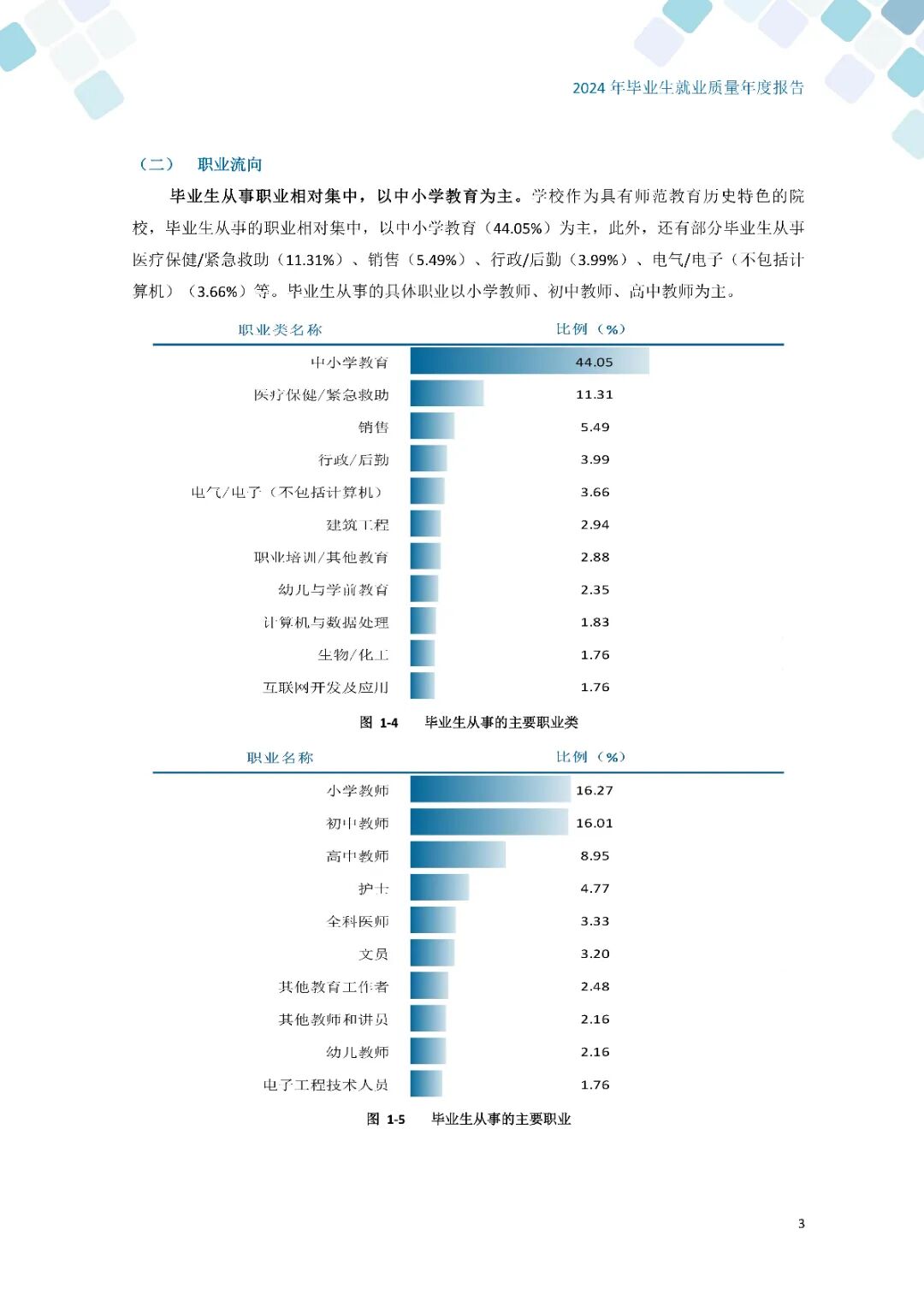 就业行业:毕业生从事的具体职业以小学教师、初中教师、高中教师为主。小学(16.38%)、初中(15.92%)、普通高中(8.45%)、综合医院(6.94%)。