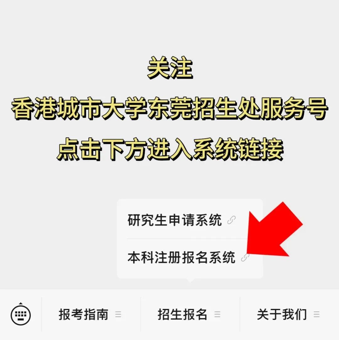 关注香港城市大学东莞招生处服务号 --> 招生报名 --> 本科注册报名系统 --> 点击“查询”,跳转到查询系统。