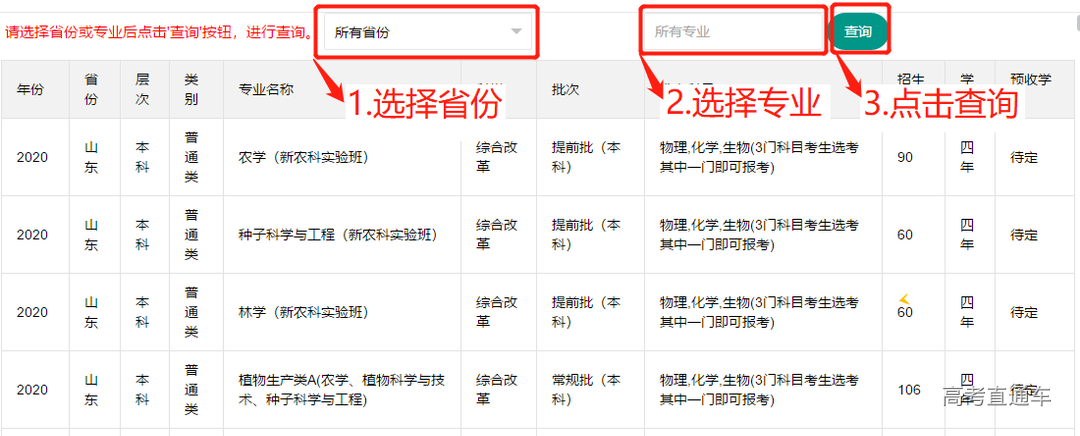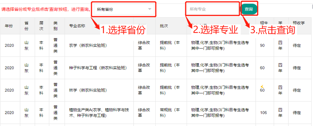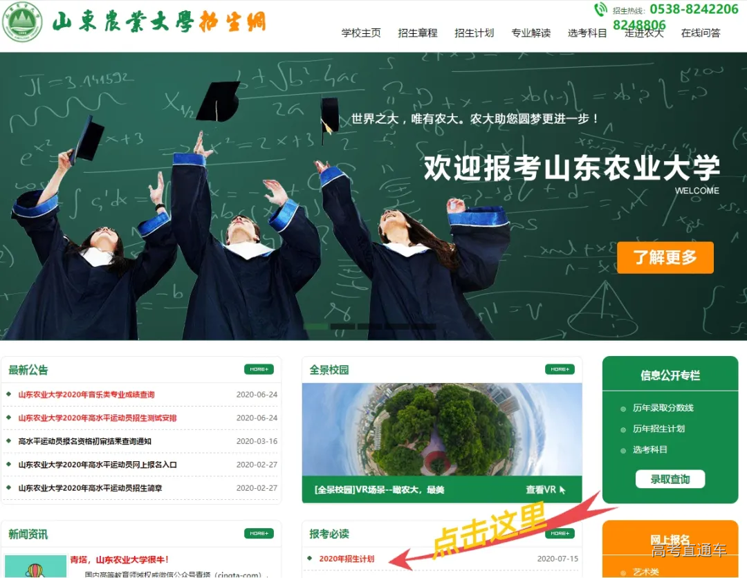 招生省份 2020 年学校面向山东、北京、天津、河北、山西、内蒙古、辽宁、吉林、黑龙江、江苏、浙江、安徽、福建、江西、河南、湖北、湖南、广东、广西、海南、重庆、四川、贵州、云南、西藏、陕西、甘肃、青海、宁夏、新疆、香港、澳门、台湾等33个省、自治区、直辖市、特别行政区招收普通本科生。 招生专业(类) 招生专业(类)涵盖农、理、工、管、经、文、法、艺术学等八大学科门类。其中,植物生产类等20个专业类实行大类招生。 招生批次、类别 ⚪提前批 (新农科实验班、公费农科生、高水平运动员) ⚪常规批 ⚪本科批 ⚪常规批 ⚪以当地招生考试机构公布为准 录取原则 实行平行志愿的省份批次,除因专业不服从调剂、体检受限、选考科目不符等特殊原因,投档考生不退档。对于山东、浙江考生,进档后考生体检不受限且符合选考科目要求,直接录取到考生所填报专业(类);对于其他省区,对进档考生按照投档成绩从高到低排序,依次视其所报专业(类)志愿顺序确定录取专业(类)。当考生投档成绩无法满足所填报的专业(类)志愿时,若考生服从专业调剂,则调剂到招生计划有缺额的专业。 使用山东省美术、体育统考成绩,按综合分投档录取。对进档考生,按照综合分从高到低排序确定录取专业;综合分相同时,优先录取专业成绩高者。 使用我校参加的相应联考平台成绩,按专业成绩投档录取。对进档考生,按专业成绩从高到低排序确定录取专业;专业成绩相同时,优先录取高考文化成绩高者。 Waiting for You... 学生入校后,享有充分的专业自主选择权。第一,新生入校学习一年后,学习成绩在专业(类)前30%的学生可在全校范围内二次选择专业,其余学生可在学校规定范围内二次选择专业(特殊类型专业除外)。第二,按照专业大类招收的学生,在大一下学期根据学生意愿和专业教学资源,在专业类内自主选择专业。 面向山东省考生招收公费农科生,考生成绩须达到山东省一段线,在提前批填报志愿。公费农科生在校期间享受免除学费、住宿费,并给予每月400 元生活补助等优惠政策;毕业后,到定向单位就业,纳入正式事业编制。招生专业为农学、植物保护、园艺、农林经济管理、农业机械化及其自动化,就业地区覆盖山东省16 个地市。 面向山东省考生设立3 个新农科实验班,考生成绩须达到山东省一段线,在本科提前批填报志愿。新农科实验班对接山东省农业农村现代化领域急需紧缺专业,旨在为打造乡村振兴齐鲁样板培养创新型、拔尖型高素质人才。招生专业为农学、种子科学与工程、林学,新生入学后单独编班,采用导师制,深度参与导师科研课题;课程设计更多结合生物技术、信息科学等前沿领域,体现新农科培养要求;符合条件的学生优先入选齐鲁学堂进行“本硕博”一体化培养。 ● ● ● 中外合作办学 会计学、国际经济与贸易、工商管理三个本科专业,学制四年,采取“3+1”培养模式。第一学年主要完成德语强化学习,第四学年合格的学生到德国留学一年。本项目借鉴德国学士学位教学模式,凡德方开设的课程,从课程设置到教材,从主讲教授到辅导助教,从教学方法到考试方式,全部从德国引进。 完成学业经考核合格的毕业生,颁发山东农业大学本科毕业证书、学士学位证书和德国埃森经济管理应用技术大学学士学位证书。 食品质量与安全、土地资源管理专业,学制四年,全部在国内完成。第一学年主要完成英语强化教育(中英双方共同进行)及部分公共基础课,从第二学年起,学生将完成专业全部必修课程及英方专业课程的学习。英方课程由英国皇家农业大学选派教师到中国授课,采用英语原版教材,全程英语教学。 完成学业的毕业生经考核合格,颁发山东农业大学本科毕业证书、学士学位证书。 动物科学专业,学制四年,全部在国内完成。第一学年主要完成英语强化教育及部分公共基础课,从第二学年起,学生将完成专业全部必修课程及专业课程的学习。专业课程由美国杜鲁门大学选派教师到中国授课,采用英文原版教材,全程英语教学。 完成学业的毕业生经考核合格,颁发山东农业大学本科毕业证书、学士学位证书。 Waiting for You... 学校与山东网商教育科技集团有限公司合作,开设商务英语(跨境电商方向)专业,学制四年,采取“3+1”培养模式。学生第1-6 学期根据校企双方共同制定的培养方案,在校内完成课程学习(适当融入企业的岗位课程),第7-8 学期以合作企业管理和实践教学为主。毕业后颁发山东农业大学本科毕业证书、学士学位证书。 奖助学金设置 学校设立了国家奖学金、国家助学金、国家励志奖学金、省政府奖学金、省政府励志奖学金、校长奖学金、优秀学生奖学金、创新创业奖学金、单项奖学金和 40 余项社会奖助学金,辅以生源地助学贷款、勤工助学、困难补助,每年为学生成才发展提供资助 5000 余万元。 学校毕业生考研升学、出国深造率稳定在 40% 以上,部分专业达到 70% 以上,考取985、211 高校研究生的比例占到 60%以上。学习成绩优秀的应届本科毕业生可免试攻读硕士研究生,每年有大批的毕业生被免试推荐到国内知名高校,免试推荐毕业生人数占到全校考取研究生总数的15%。 学校把就业工作融入立德树人全过程,以毕业生高质量和满意就业为目标,本科毕业生就业率稳定在 92%以上,学校被评为全国普通高等学校毕业生