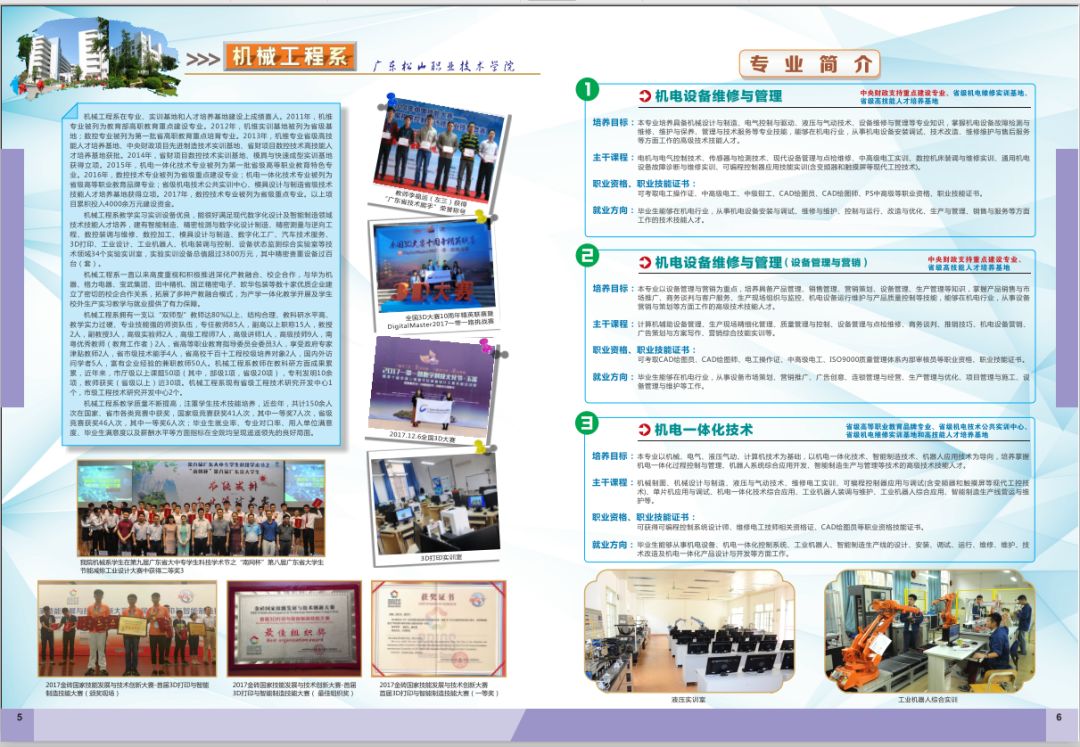 学院坚持产教融合,校企合作,按照“推动专业设置与产业需求对接、课程内容与职业标准对接、教学过程与生产过程对接、毕业证书与职业资格证书对接、职业教育与终身学习对接”的思路,积极探索订单式人才培养、中高职衔接三二分段人才培养、三二分段专升本协同育人、现代学徒制等人才培养模式,形成了布局合理、特色突出,紧密结合地方经济发展和岗位需求的专业群。其中,电气自动化技术专业为省高职高专教育示范性专业;数控技术、软件技术、物流管理三个专业为广东省高等职业教育重点专业;机电设备维修与管理、市场营销专业为中央支持高职院校提升专业服务产业发展能力项目重点专业;电子信息工程技术专业为省高职教育重点建设专业;机电一体化专业为省级高等职业教育品牌专业。