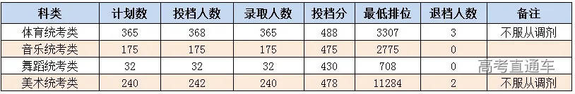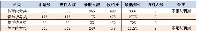 我校2020年广东省本科批体育艺术类统考专业于2020年8月14-15日投档录取,所有专业均第一志愿满档。 各类投档最低分分别为:体育488分、美术478分、音乐475分和舞蹈430分。有5名考生因不服从专业调剂无法录取所报专业而退档。现将我校体育艺术类统考投档录取情况公布如下: 注明:我校在广东省本科批次的体育类及艺术类(不含书法学专业)专业的录取规则如下: 根据广东省投档规则出档后,按“分数优先,遵循志愿”原则录取,即按照投档总分由高到低的顺序,优先安排高分考生的第一专业志愿,若该专业额满,再逐一查看该生的后续专业志愿。投档总分相同时,排位前者优先录取。 专业录取结果已上传至学校招生网,查询地址:http://zsb.lingnan.edu.cn/xxcx/pglqcx.htm 岭南师范学院招生办公室 2020年8月16日