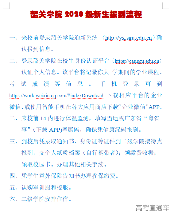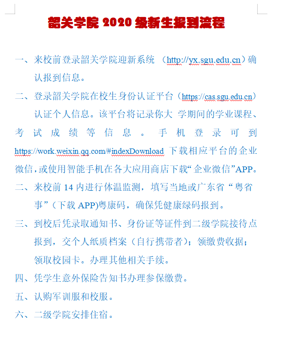 来校前登录韶关学院迎新系统 (http://yx.sgu.edu.cn)确认报到信息。登录韶关学院在校生身份认证平台(https://cas.sgu.edu.cn)认证个人信息。该平台将记录你大学期间的学业课程、考试成绩等信息。手机登录可到 https://work.weixin.qq.com/#indexDownload 下载相应平台的企业微信,或使用智能手机在各大应用商店下载“企业微信”APP。