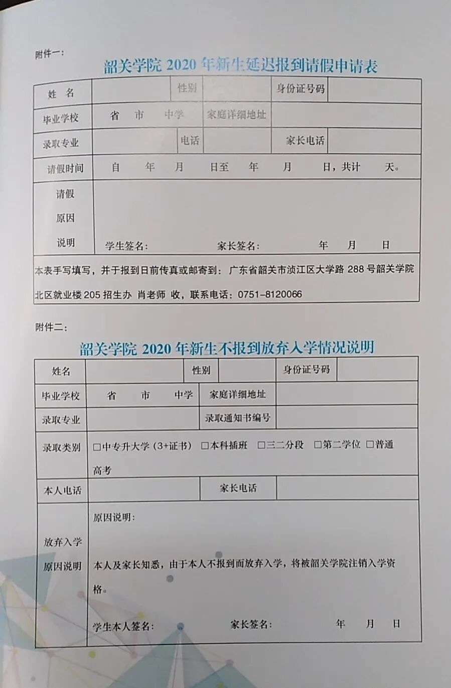 (三)如因特殊情况不报到入学者,请填写《韶关学院2020年新生不报到放弃入学情况说明》,并将录取通知书于2020年10月8日前寄回:广东省韶关市浈江区大学路288号韶关学院北区就业楼205招生办 肖老师 收,联系电话:0751-8120066。