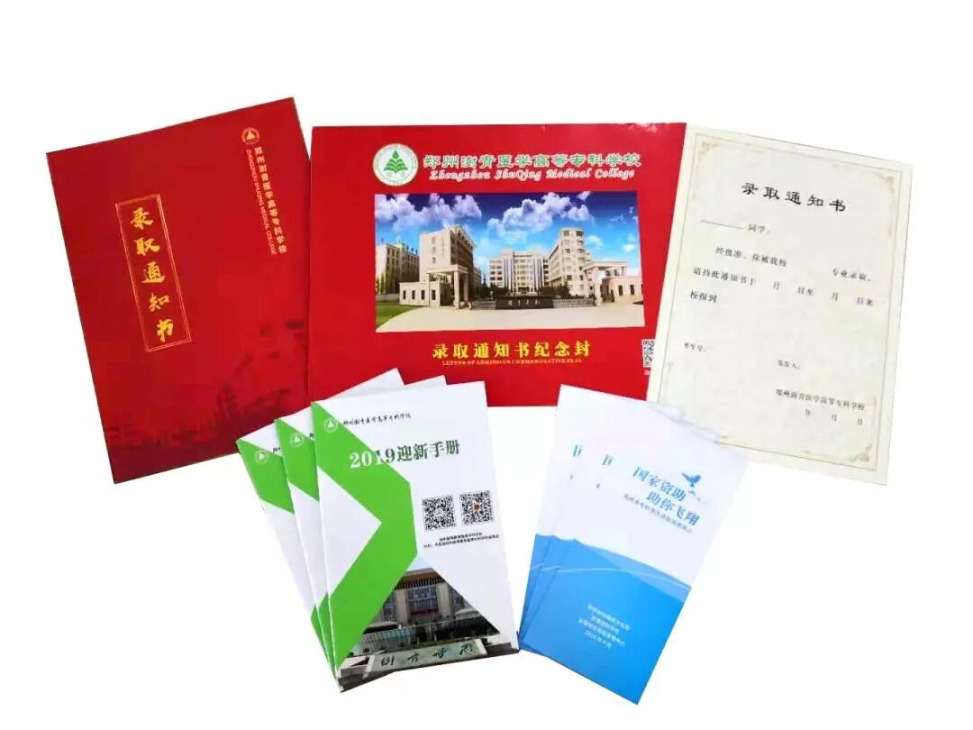 郑州澍青医学高等专科学校的录取通知书以红色为主色调,以学校主要建筑群为背景图案,以校徽、校训、创办人寄语、医学生誓言为元素、秉承简约、实用的原则进行设计和印刷。