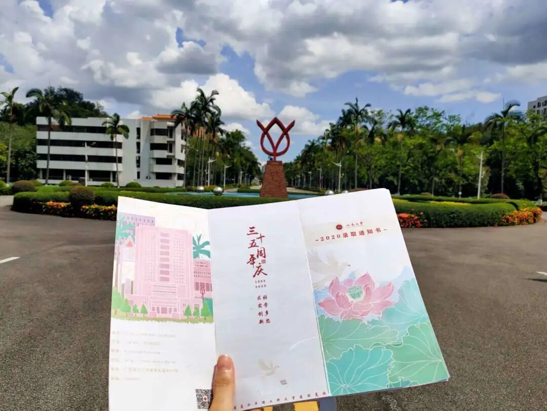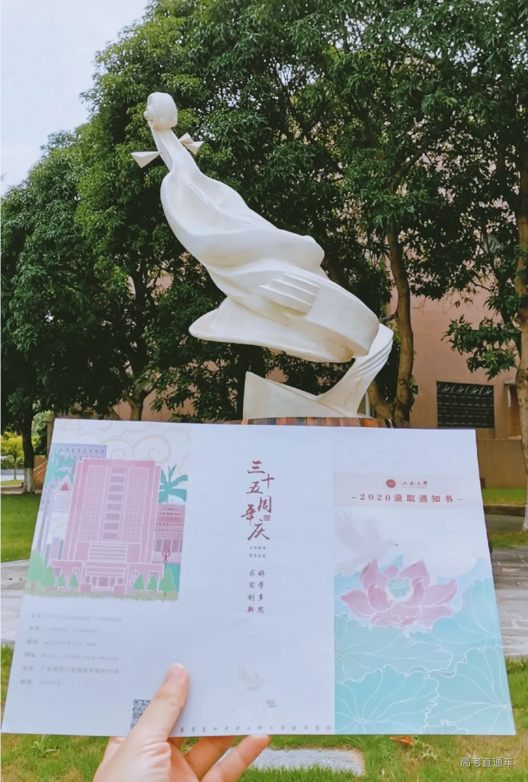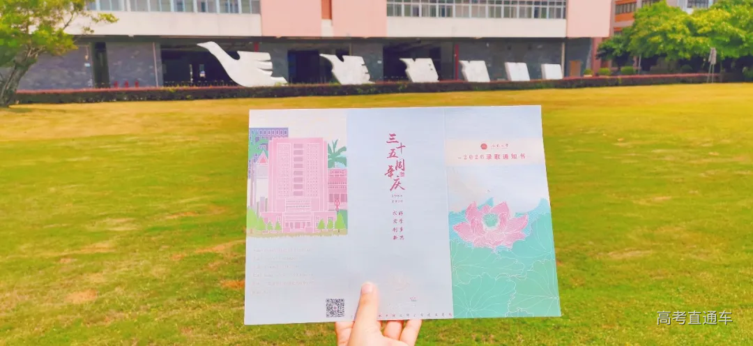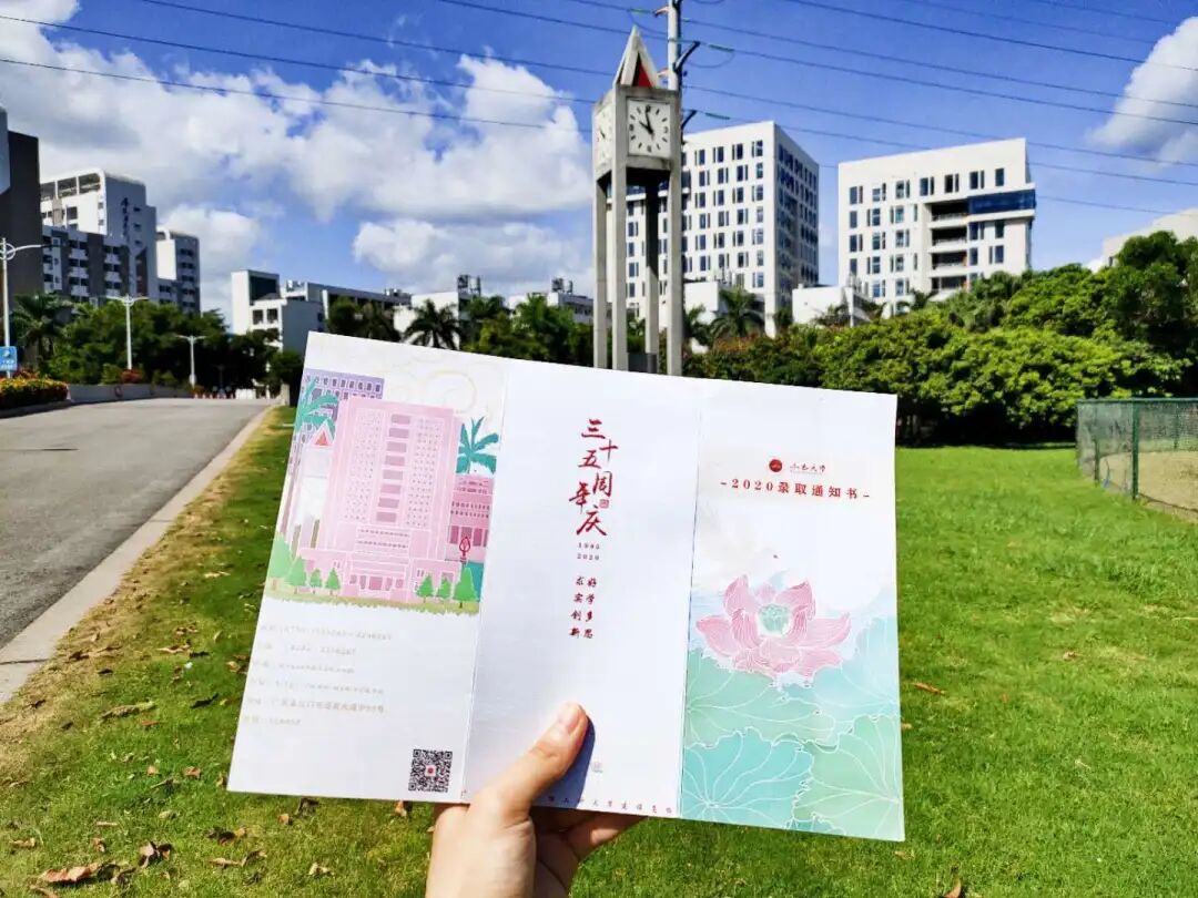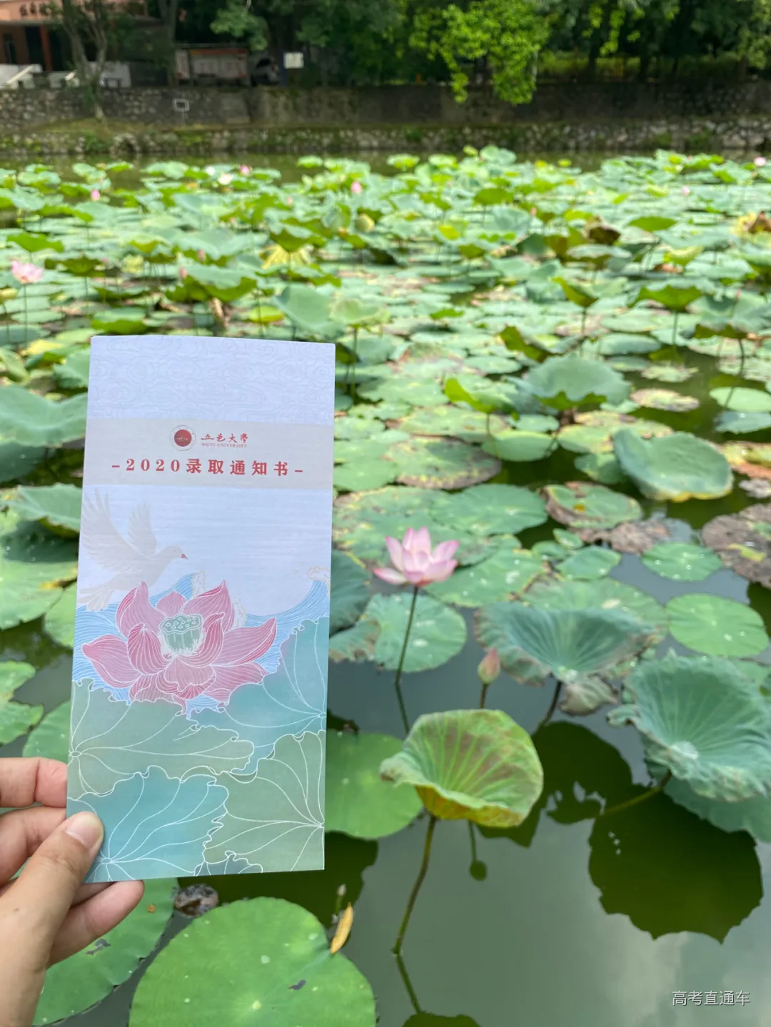 经过层层选拔, 脱颖而出 邑大学生设计, 满含情怀 今年录取通知书的设计者是我校艺术设计学院视觉传达设计专业的郑青连同学,录取通知书的灵感主要来源于校园的荷花、标志性的建筑:白鸽雕塑、南、北主楼等;清新、淡雅的色彩为主调;录取通知书采用三折式的样式,正面为层层叠叠的荷叶与飞翔的白鸽,象征着蓬勃与朝气;校训“好学 多思 求实 创新”代表着邑大人的精神。 << 滑动查看更多设计细节 >> 在明媚的阳光下 真是闪闪惹人爱 来,镜头拉近—— 跃出水面的锦鲤 等待你的满塘荷花 还有,邑大对你最真挚的祝福 都凝结在这一张通知书中
