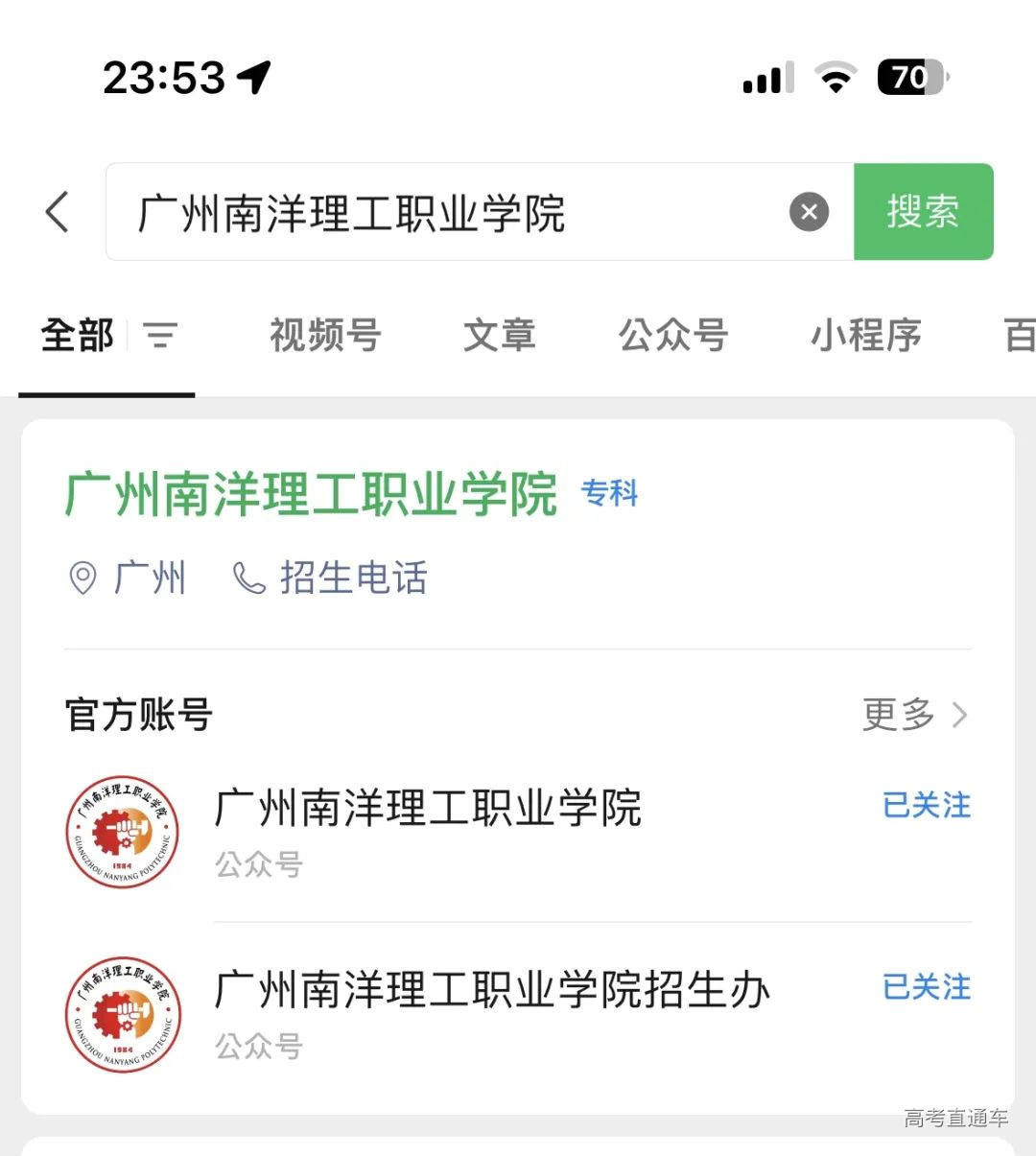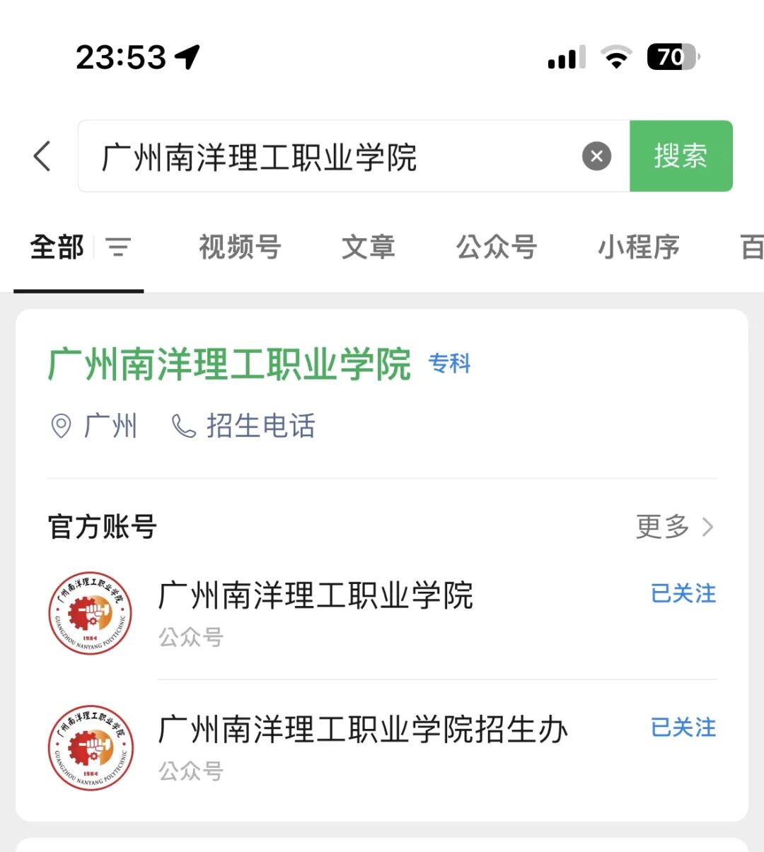 或在微信最上方“放大镜”栏位,输入“广州南洋理工职业学院”搜索,并关注。