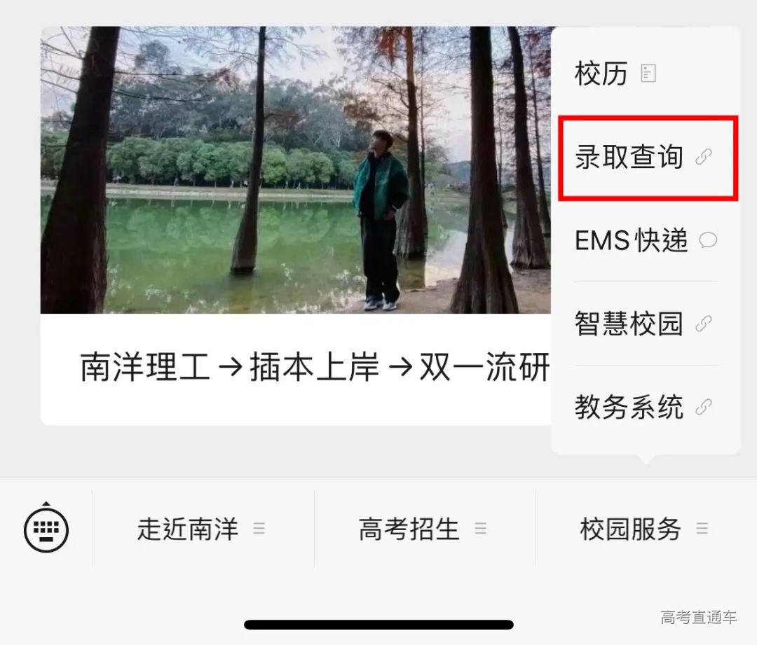 在最下方菜单栏点击“校园服务”——“录取查询”,输入信息。省内考生输入十位数字准考证号,即可查询录取结果。