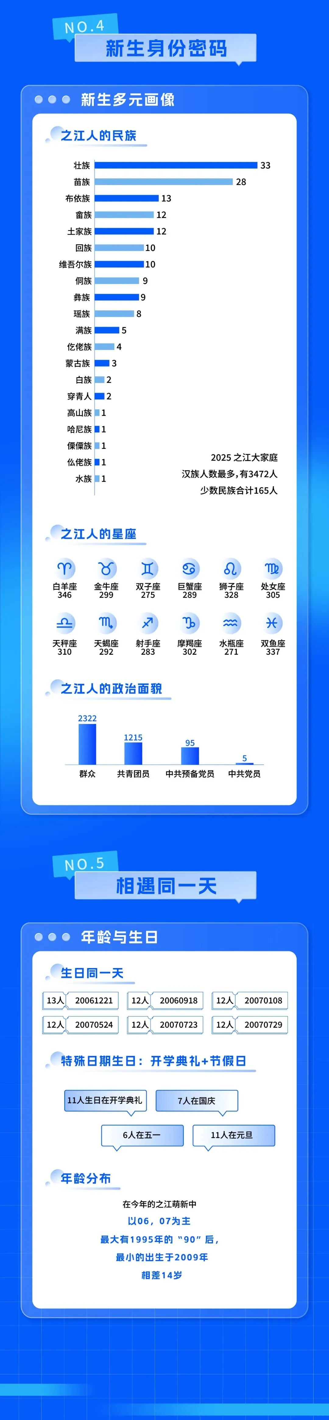 当八月的风捎来新的期待 25级新生们带着青春的热忱 即将奔赴而来 这份新鲜出炉的新生数据报告 藏着多少有趣的秘密? 最萌年龄差?男女比例? 今天 带你解锁这份“隐藏档案” 一起围观这场关于青春的狂欢 一串串数字背后 是一个个鲜活的身影 是即将在校园里绽放的无限可能 愿这份数据里的小确幸 能成为你们大学生活的第一份惊喜 让每一个“数字”都成为成长的注脚 新学期,新开始 我们在这儿,等你闪闪发光 欢迎新之江er 加入之江大家庭