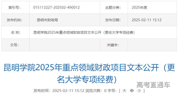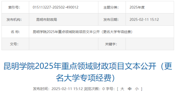 2月11日,昆明市财政局网站发布《昆明学院2025年重点领域财政项目文本公开(更名大学专项经费)》文件。