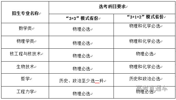 1.招生专业:数学类、物理学类、生物技术、哲学、核工程与核技术、工程力学。在非高考综合改革省份,哲学专业招收文科生,其他专业招收理科生。对实行高考综合改革省份的考生,选考科目须满足以下要求: